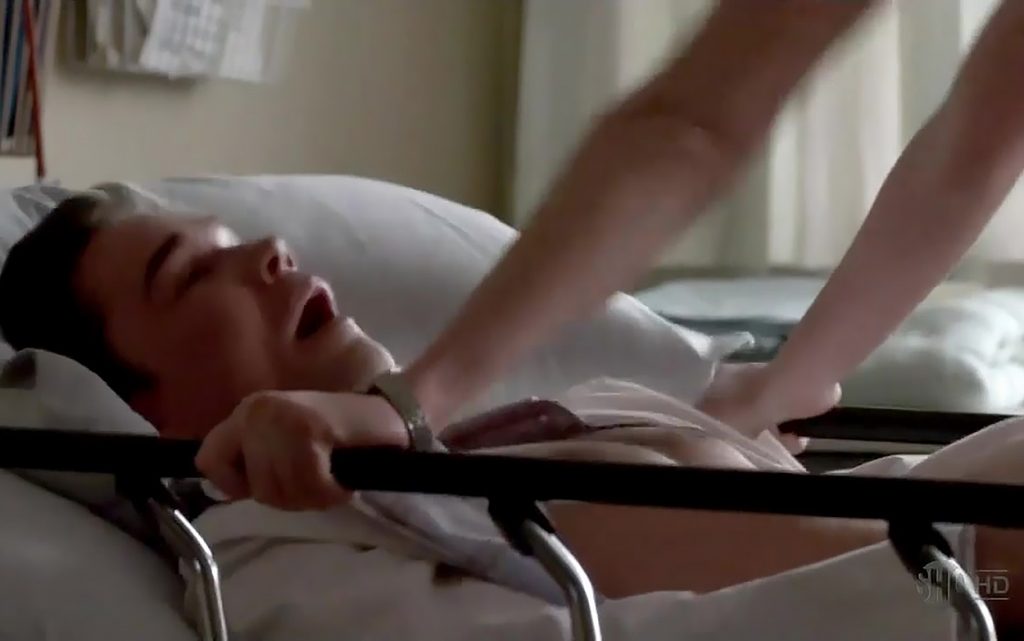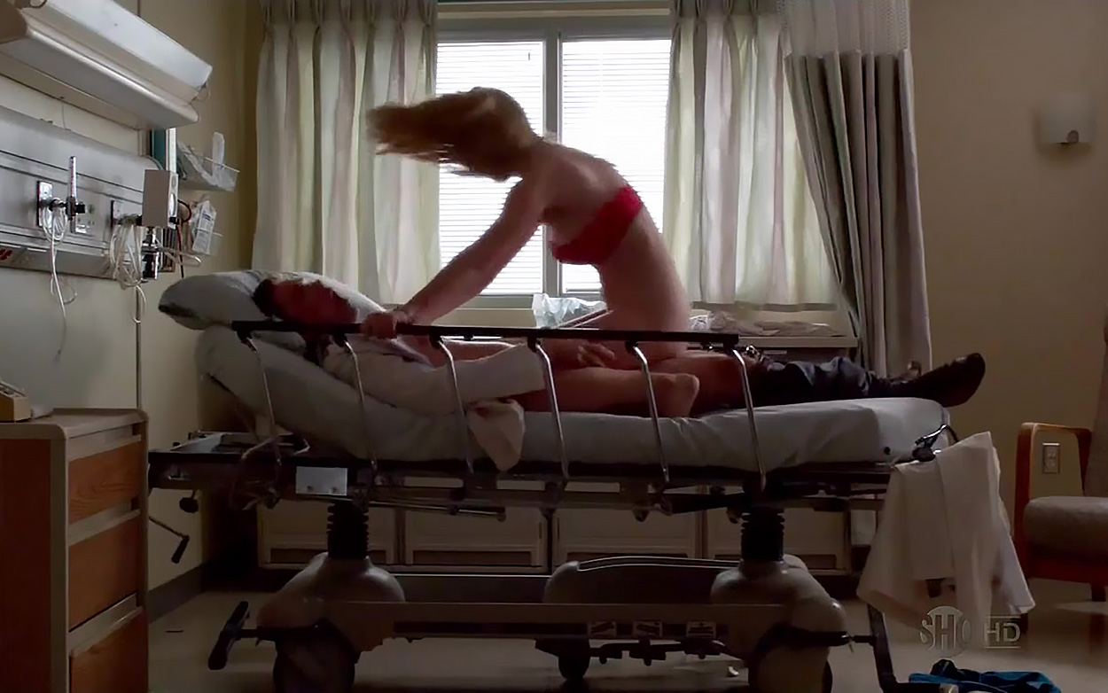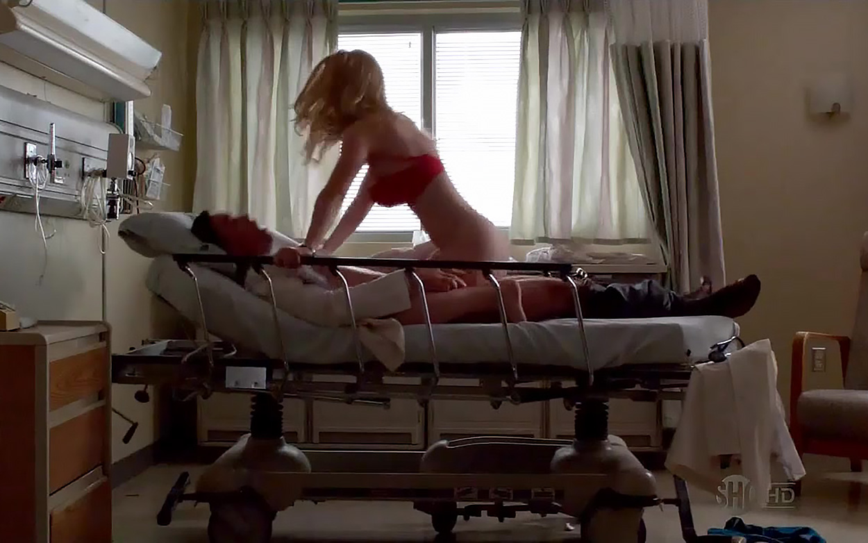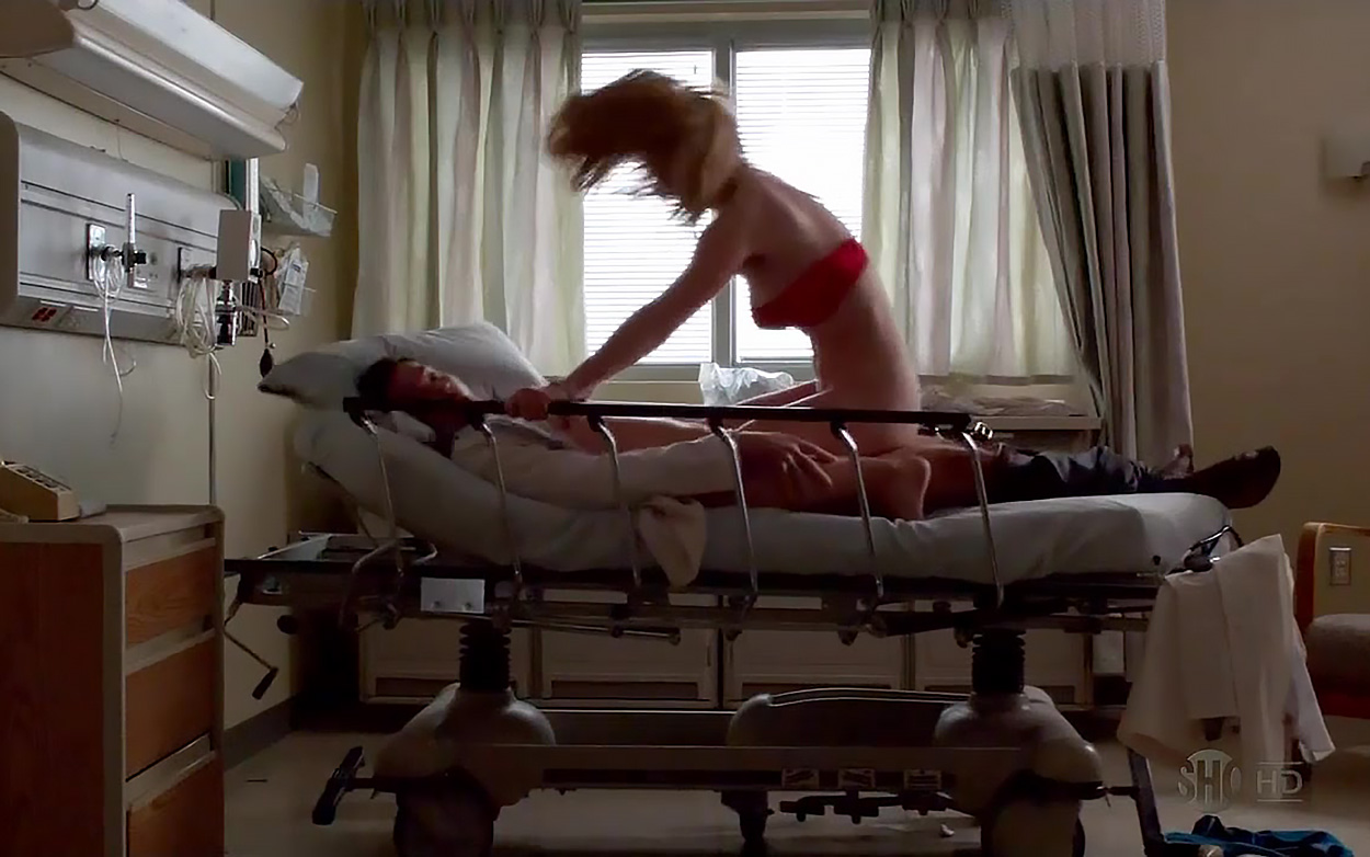 Betty Gilpin in red lingerie while having sex in a hospital dressed as a nurse. This is one intense sex scene, and in moments you can think that she will break the hospital bed. She jumps on doctor so hard. Before they get interrupted by another nurse.