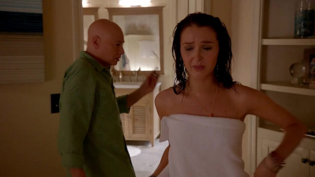 Camilla Luddington takes off white towel around her and reveals her nude boobs and busty butt. She continues kissing a guy and we get a good look at her . A great nude scene from Californication.