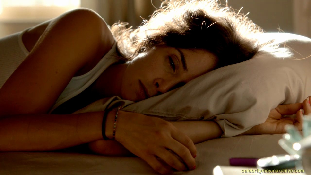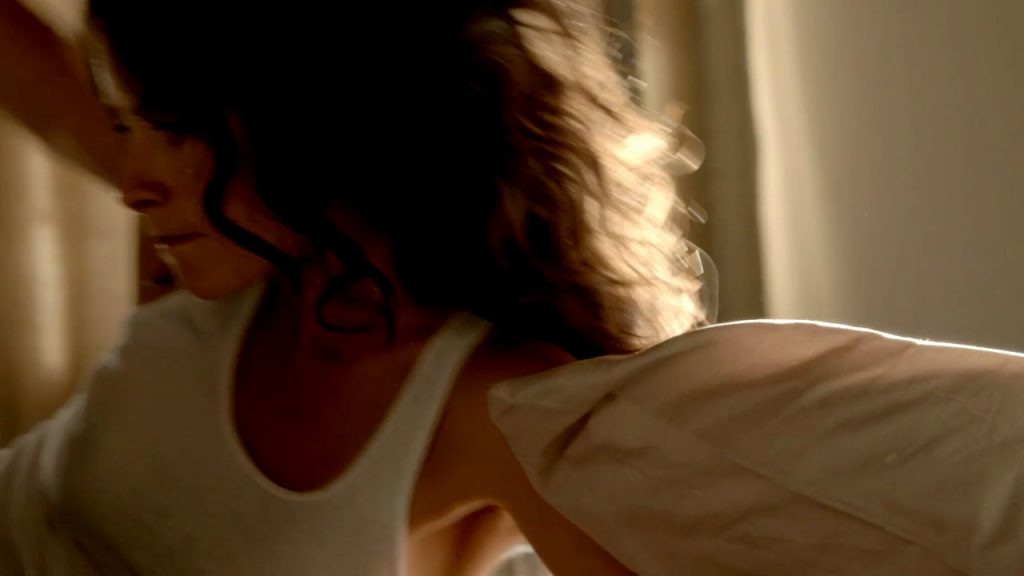 The first scene is from a TV show called “Rectify”. In this scene we see Abigail wake up in the morning and roll around in the bed a little before getting up all the time wearing a white tank top that reveals her dark nipples underneath.