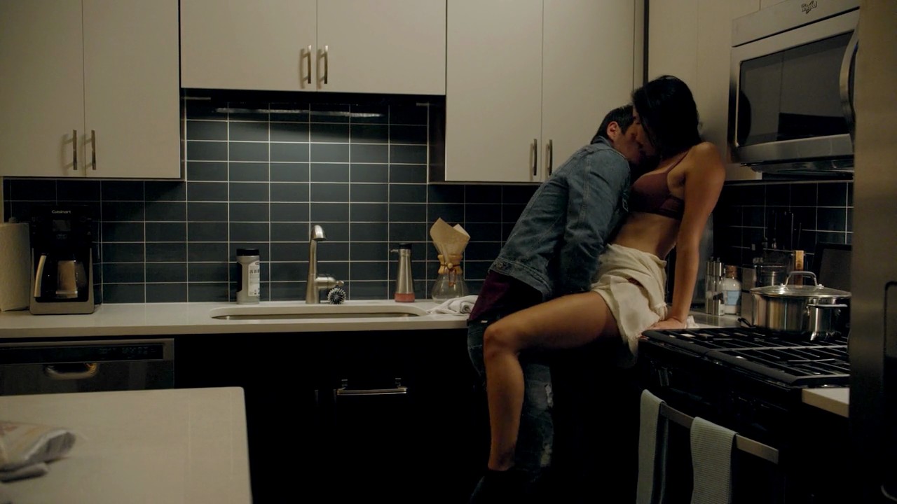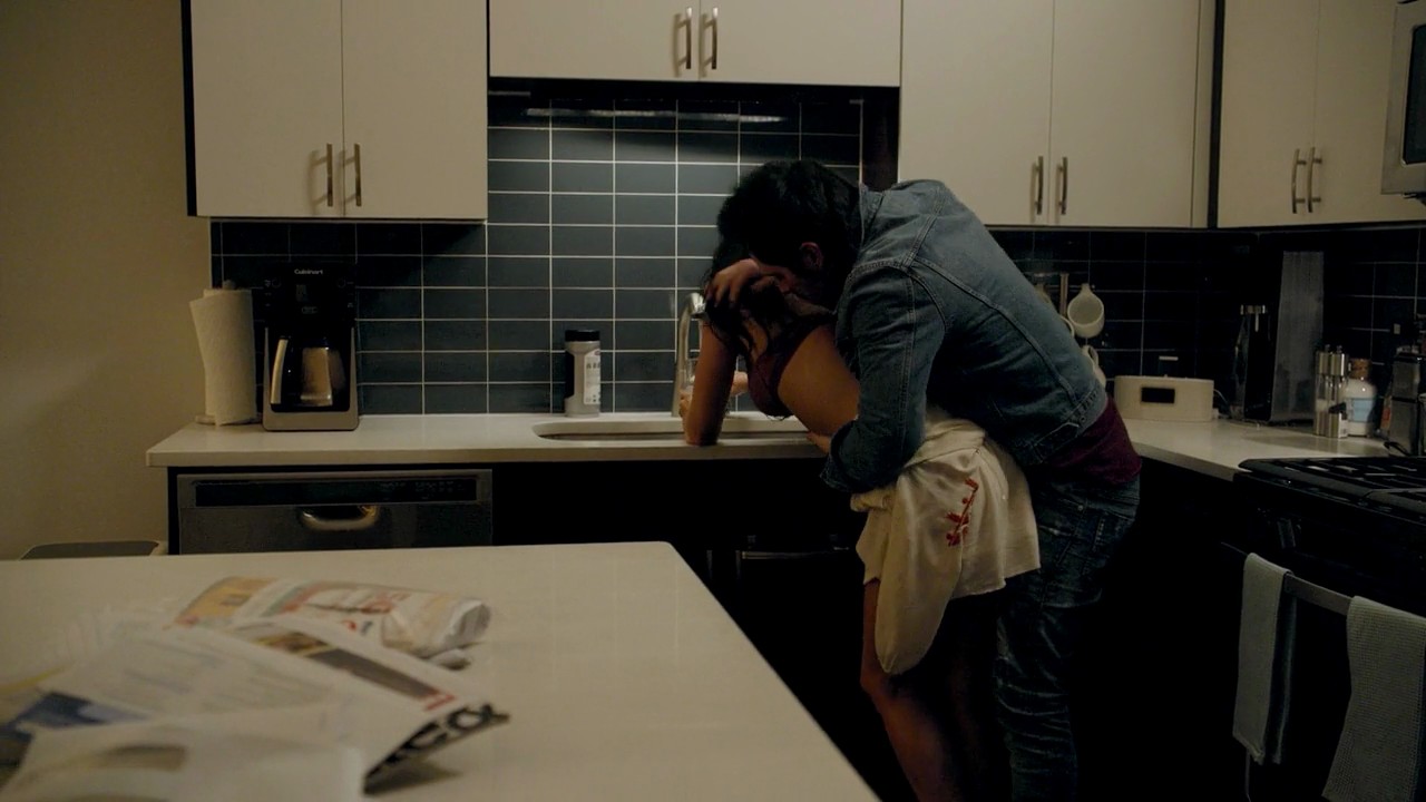 Firstly, we see Aislinn Derbez bent over a bed with her panties sticking out from under her dress as a man watches her. Then he joins her on the bed and takes her panties off under her clothes before she gets up and gets out of bed. Then she moves to the kitchen, where the guy joins her and they have sex on the kitchen counter, her dress falling out of her shoulders to reveal her cleavage in her bra. The guy follows her around the room to the window, where she’s standing with her hands on the glass, and the guy’s having sex with her from behind as he’s groping her breast in her bra with one hand.