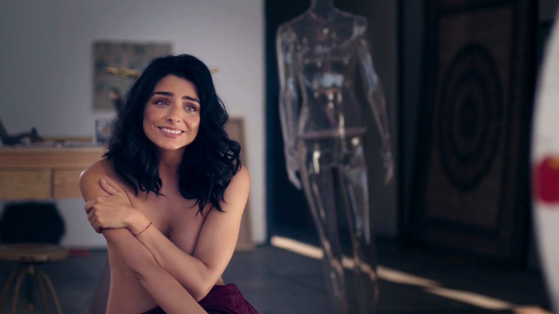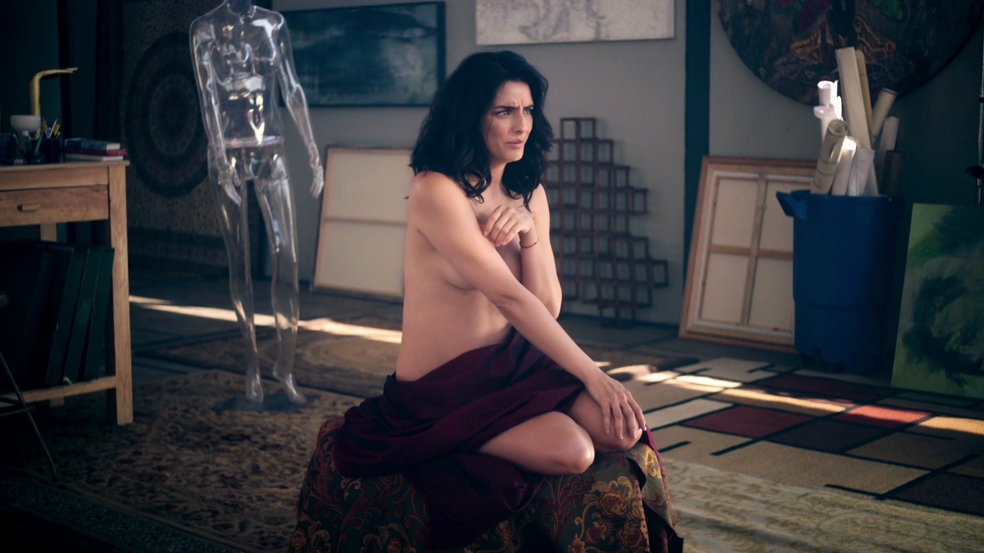 The next couple of scenes are from a TV show called “The House Of Flowers”. In this scene Aislinn Derbez is seated topless with her arms crossed in front of her as she poses for an artist. She almost uncovers a nipple as she moves her body, finally reaching down to pick up some clothes when the man comes up.