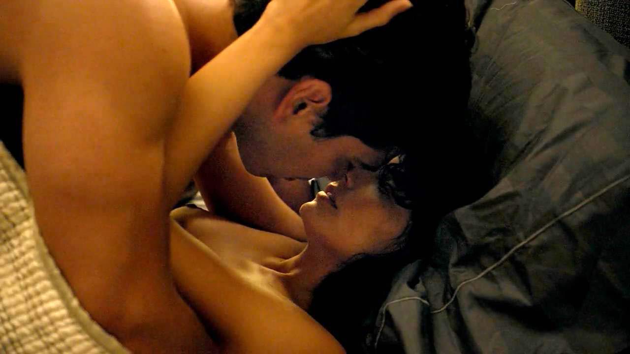 The first two scenes are from a movie called “Easy”. In the first scene Aislinn Derbez on her back under a man in bed as they have sex, her right breast visible as she’s putting her hands on her stomach.