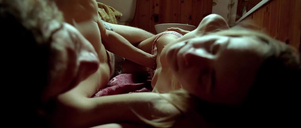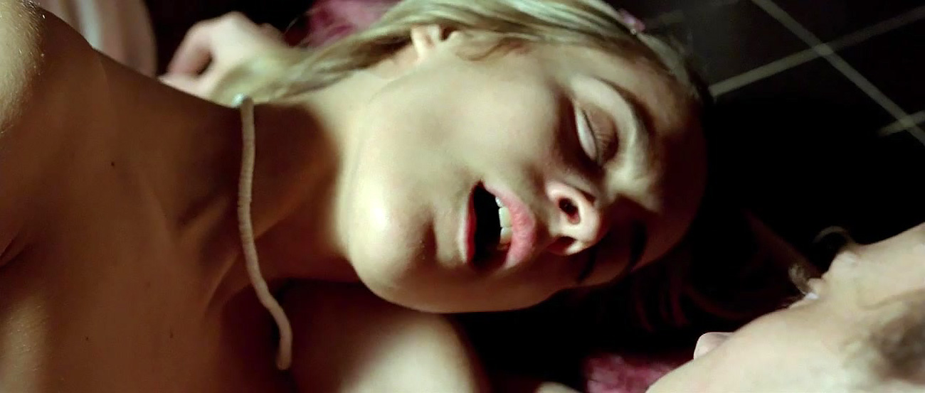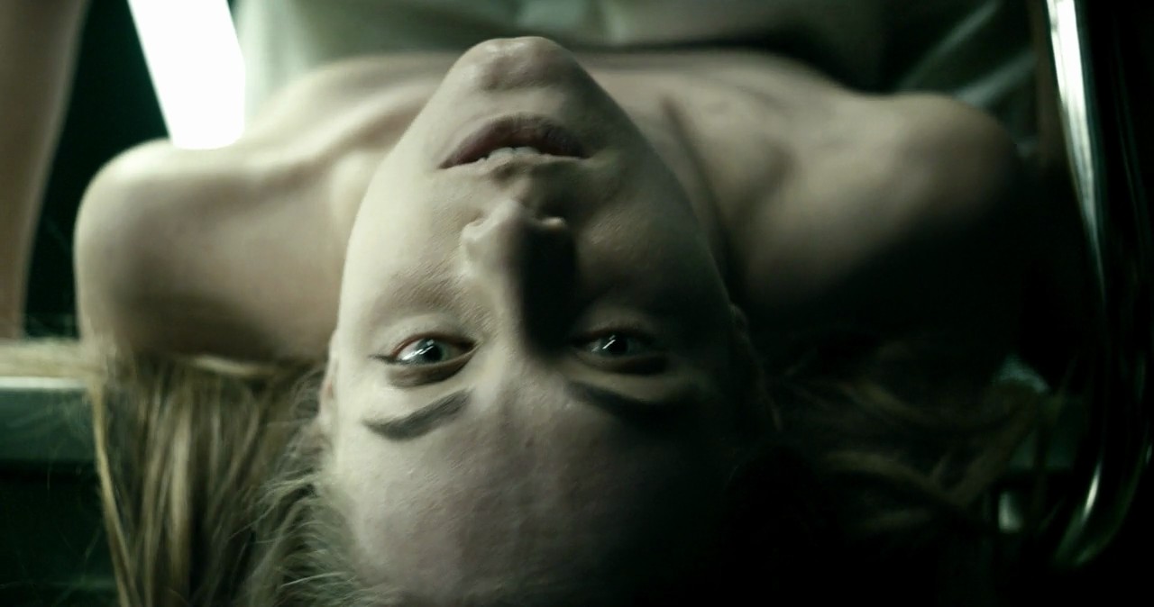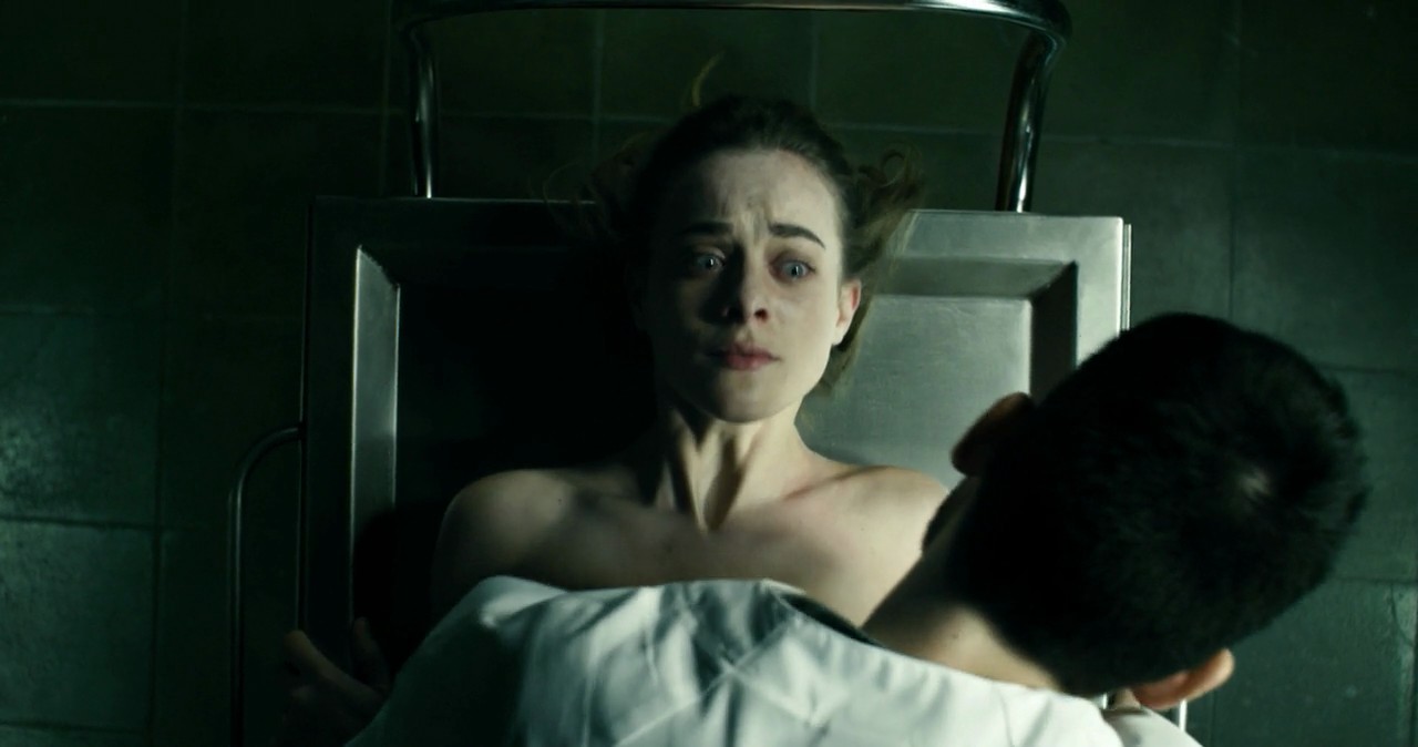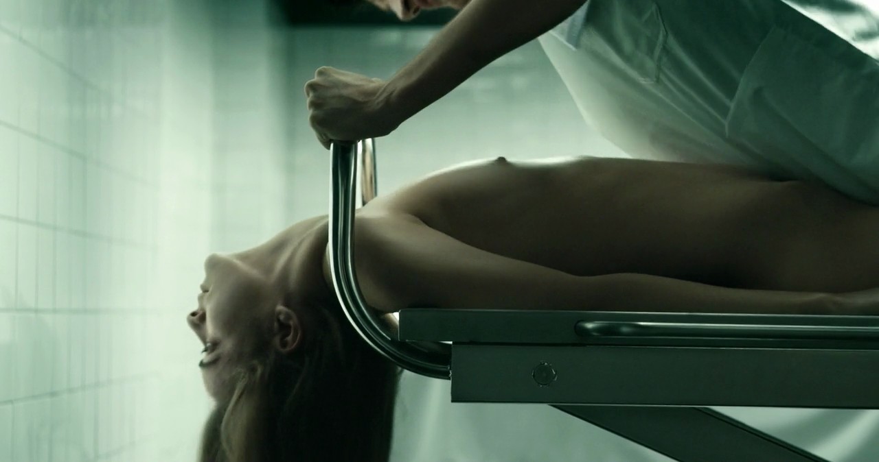 Now, the next couple of scenes are really weird, and they’re all from a movie called “The Corpse of Anna Fritz”. Alba Ribas lying naked on her back, seen from the side as a man runs his hands up his legs and across his stomach before he smells his hair. The guy then climbs to the top of her table and starts having sex with her. We see her breasts as she wakes up and opens her eyes.