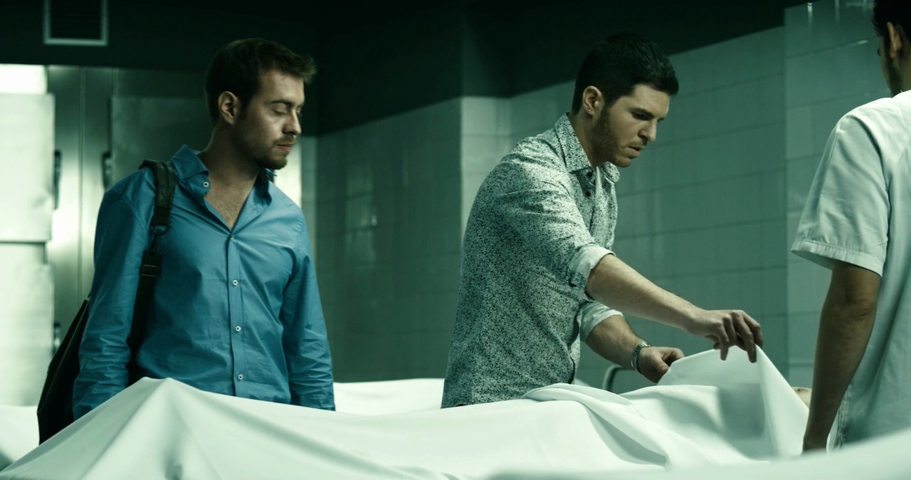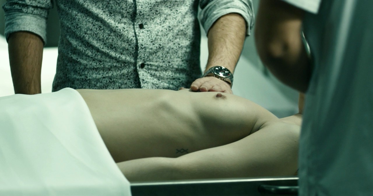 Alba Ribas on her back at a morgue table, as some of the guys pull down the sheet that covers her, exposing her bare boobs. The guys reach over to pinch her breasts until they cover her back with that sheet.