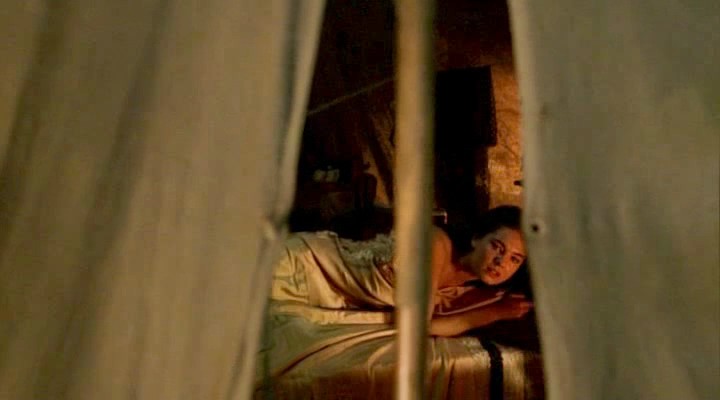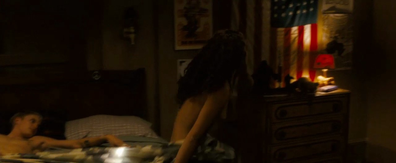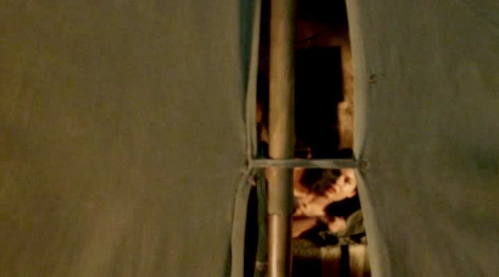 The next scene is from a movie called “And Starring Pancho Villa as Himself”. We, in this scene, see Alexa Davalos while she’s lying on her side and cuddling with a guy. She then rolls over and adjusting herself as the guy climbs on top of her, revealing her breasts, until they finally hear something outside their tent, and the guy goes to investigate while Alexa watches.