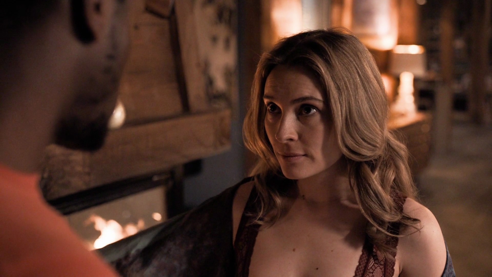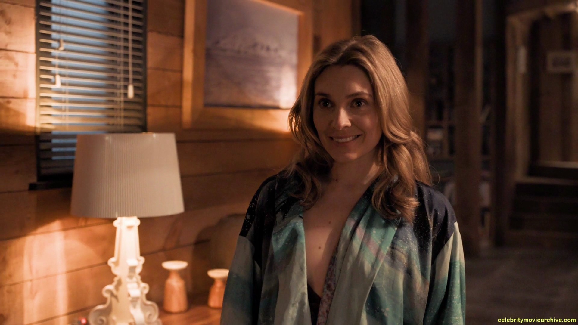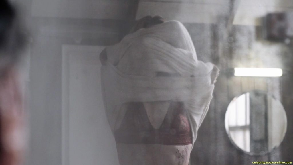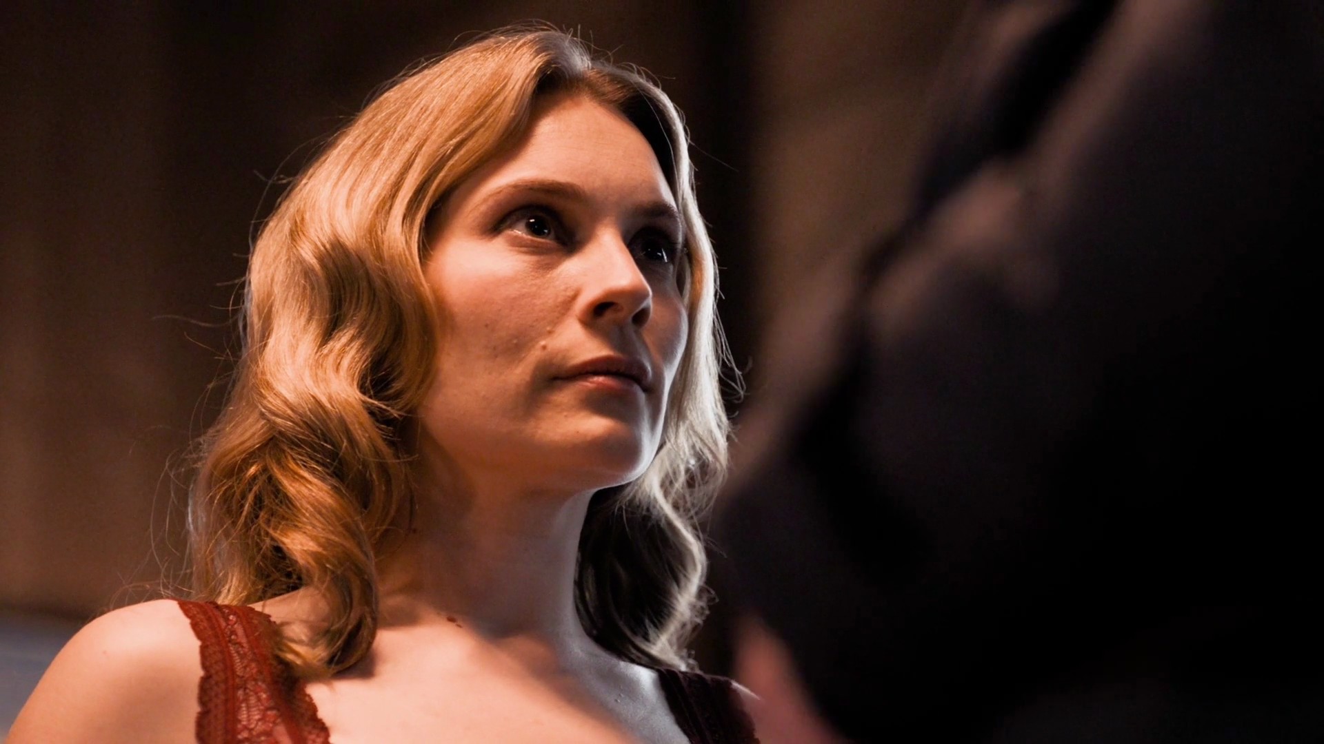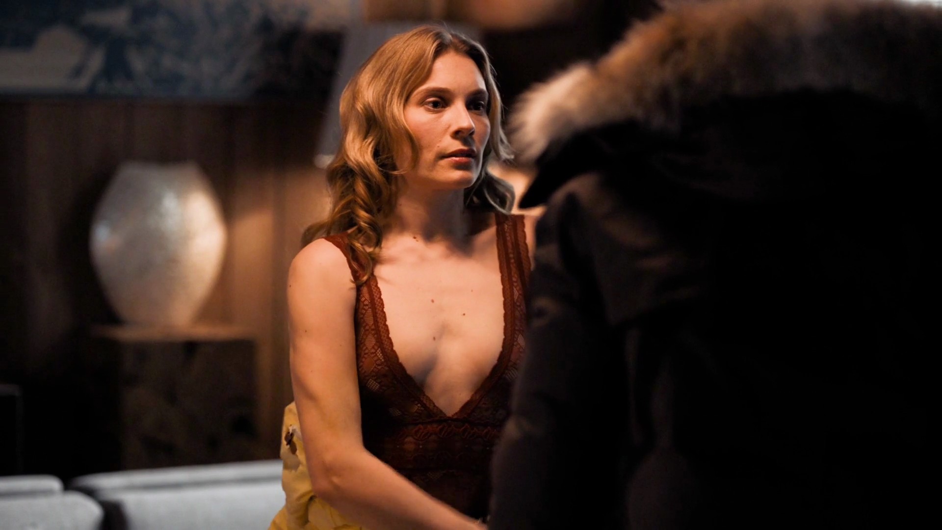 Next scenes are from a TV show called “Fortitude”. We, in this scene see Aliette Opheim approaching some man. She’s opening up her dress to expose some lingerie underneath. Her left nipple is visible underneath before she throws her arms around the guy and starts kissing him.