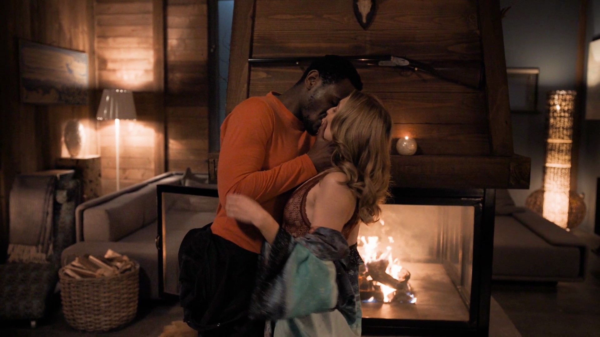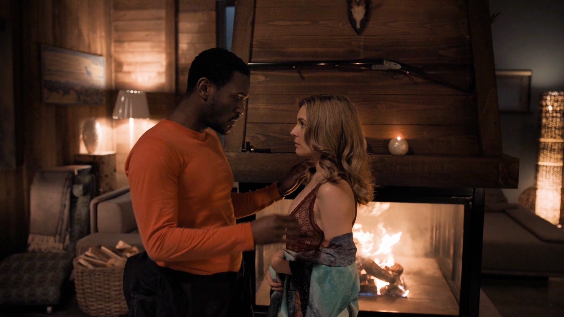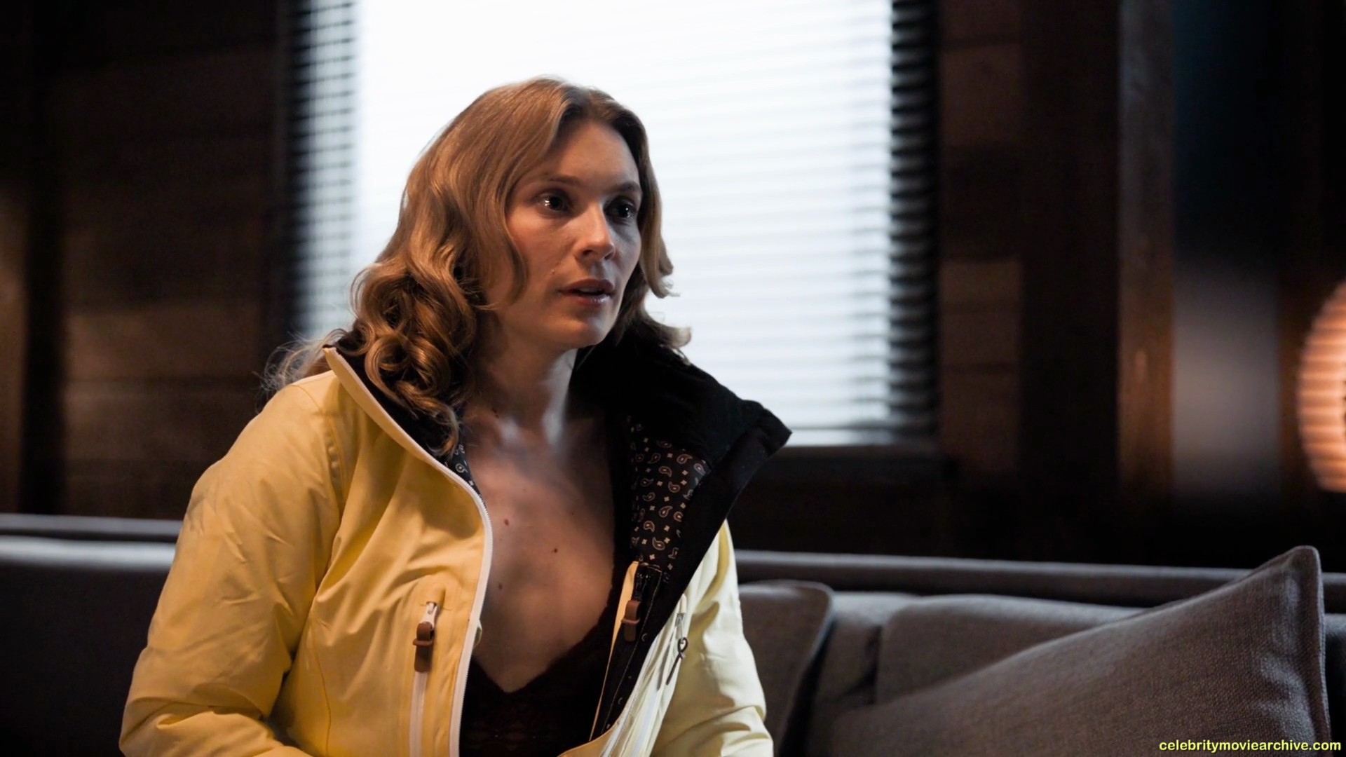 In the next scene we see Aliette Opheim while she unzipps a snowsuit down to her knees. She exposes some lingerie underneath. Her right nipple barely visible momentarily before wrapping her arms around a man and making out with him.