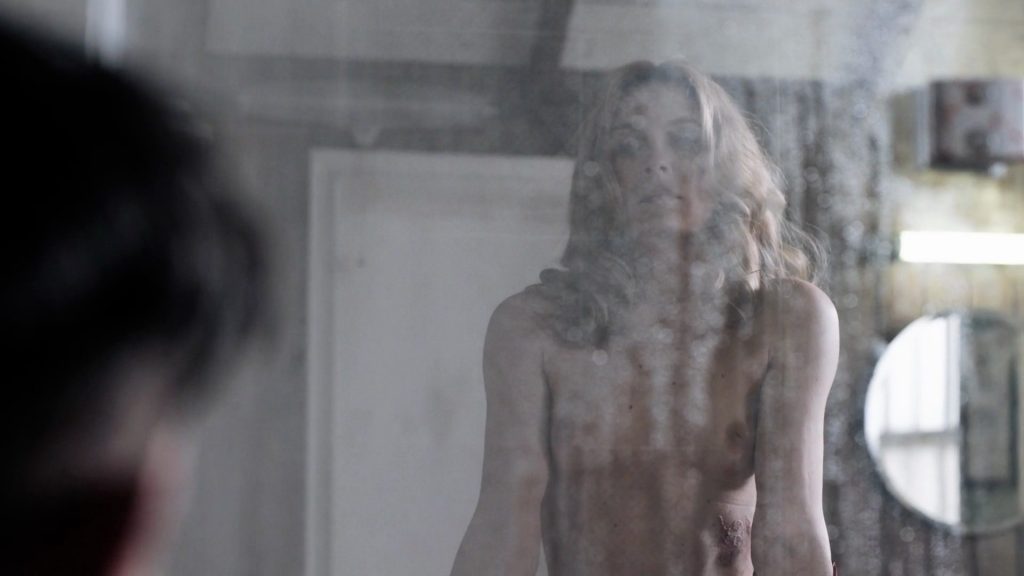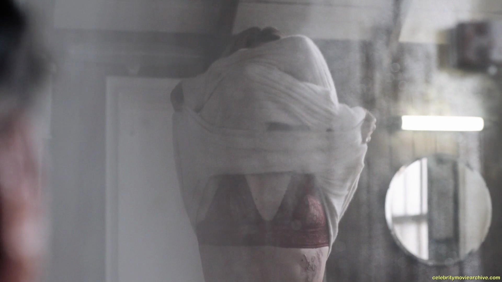 In the last scene Aliette Opheim is undressing in the bathroom as a man watches her from a shower. Aliette takes off her bra and panties to expose her breasts and ass before she goes into the tub and kisses him.