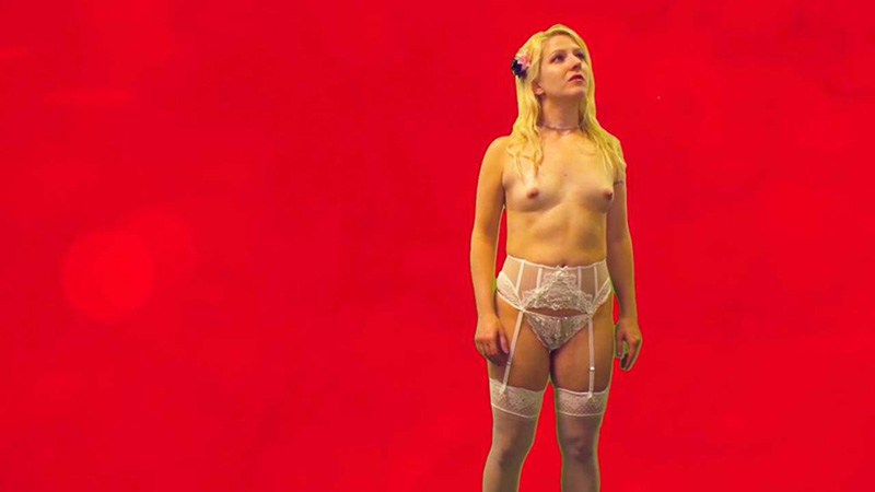 Andrea Hall’s topless and barely glimpsed white lace string panties as she wanders around a kind of limbo talking to someone while revealing her breasts and butt in a loop.