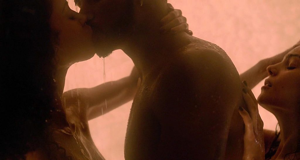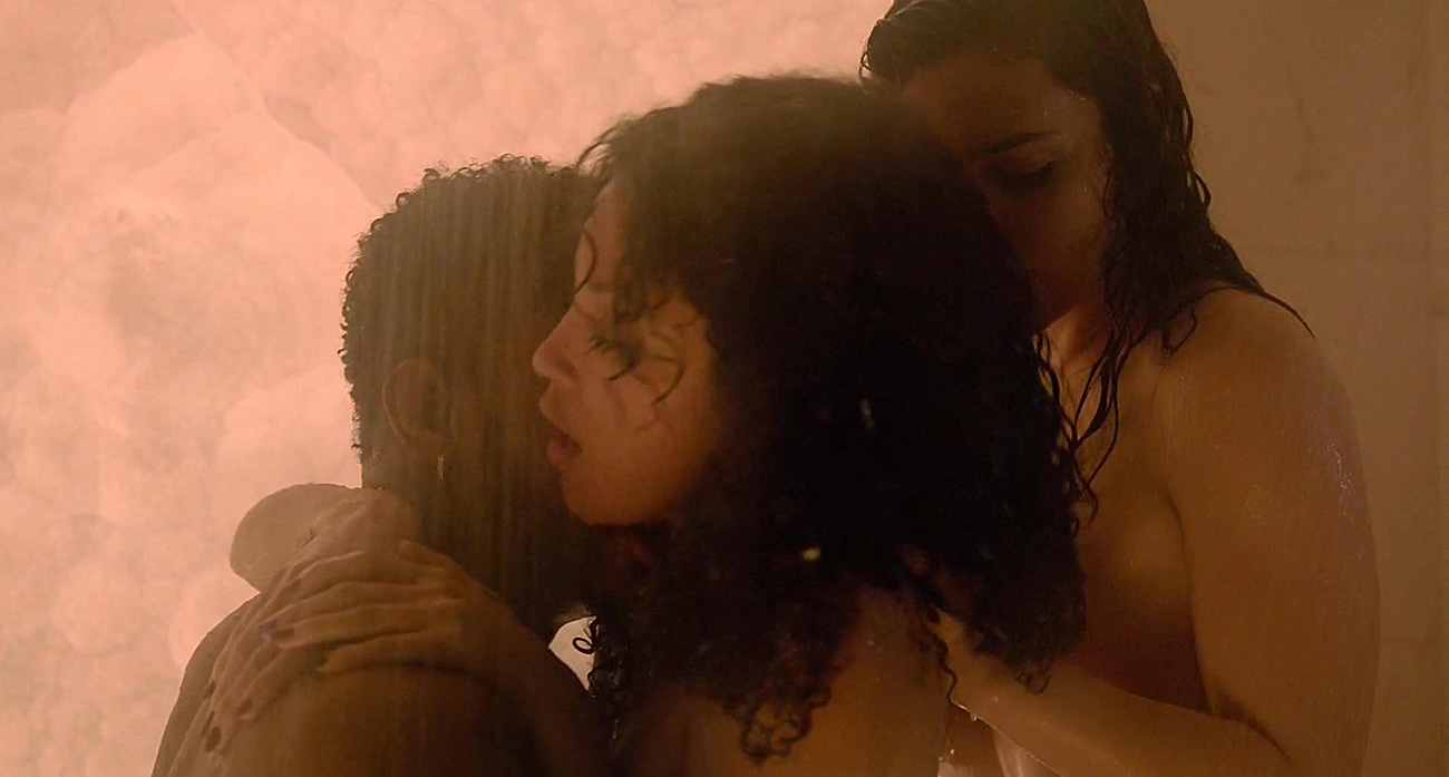 The first scene is from a movie called “SuperFly”. The first scene shows us some girl taking down her robe, as she steps into the shower with some guy. She’s standing in his arms as Andrea Londo then stepped into the room, lowering her cover and showing off her butt and breasts. She joins the other two in the wash, and we see the girl’s breasts, but with no nipples, as she and the guy continue to have sex against the shower wall. Andrea turns around, and the guy then is having sex with her from behind before the two girls kiss. The threesome then goes on with Andrea straddling the guy’s face and the second girl riding him. The two girls are facing each other and kissing some more. Eventually, we get another topless glimpse of Andrea as she and the girl recline in the arms of that man.