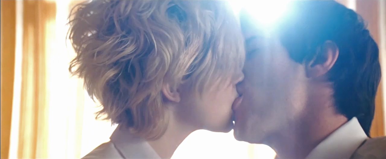 The next scene is from a movie called “Love You More”. Andrea Riseborough gives us a look up between her legs as she adjusts to the bed before she tells a guy that she wants him to spit on her, and they take turns spitting beer in each other’s faces. They start making out as he runs his hand up her skirt, and they take off her top to expose a pink bra as he gropes at her breasts until they fail to get his jacket and tie off, but at last they do.Eventually, they took off her bra to expose her breasts, and she put her hand down her trousers, and gave him a handjob as he rubbed her between her thighs, before he could eventually stop and cums caused her to lick it off her hand and then insert her fingers in her mouth.