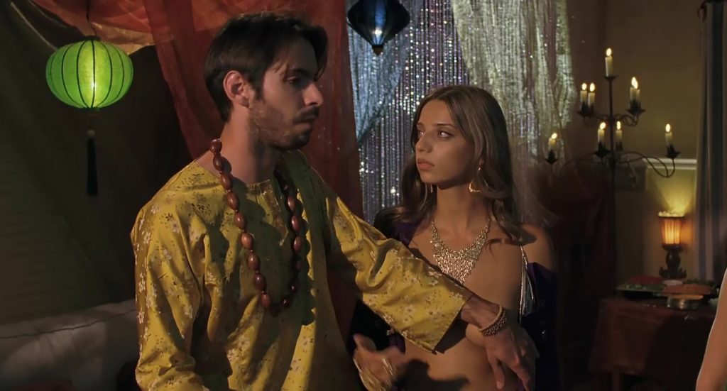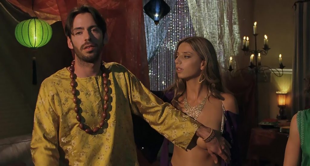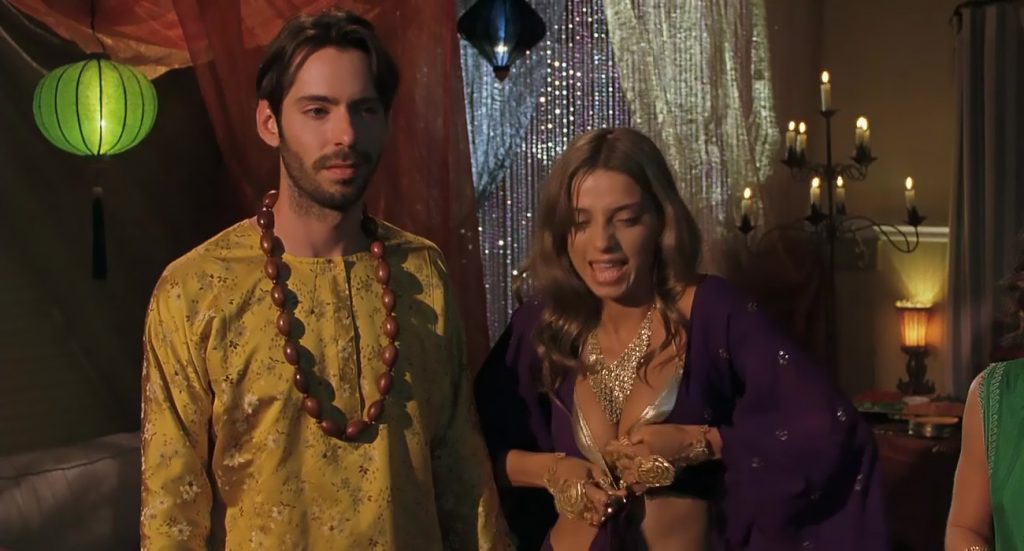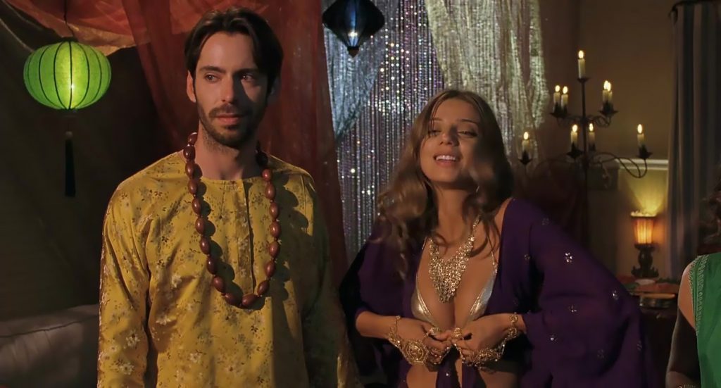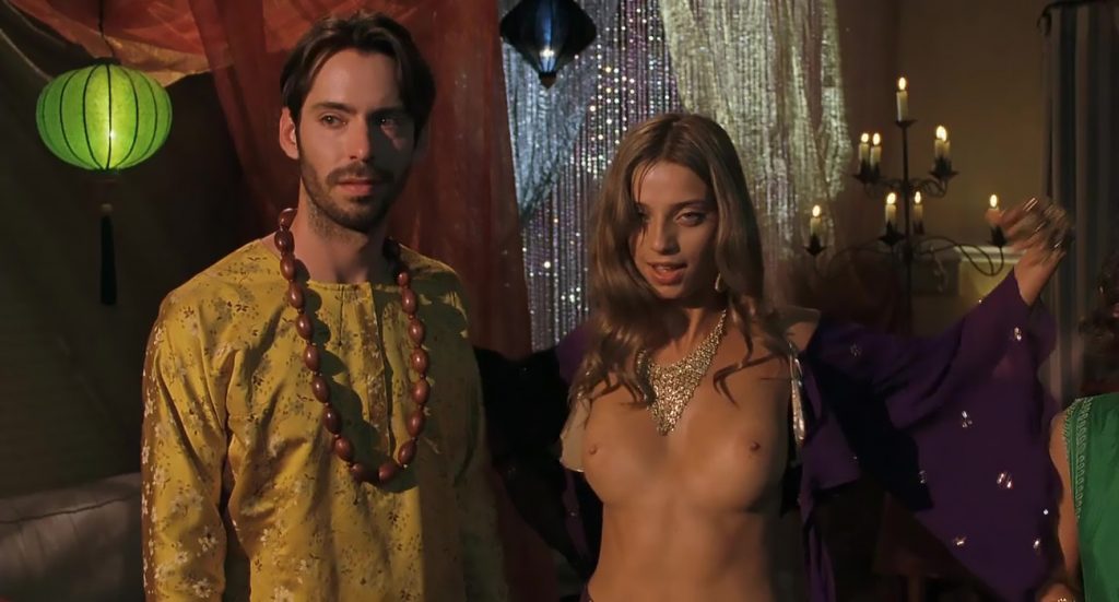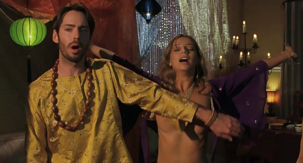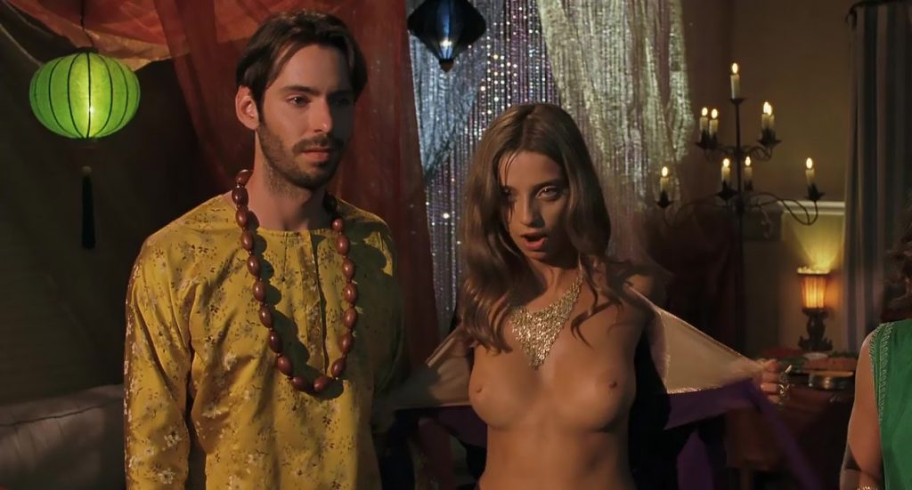 Next scene is from a movie called “A Good Old Fashioned Orgy”. We can see Angela Sarafyan is undressing her silver bikini top and pulling it open to expose her breasts as she stands in a circle of boys and girls. The guy next to her reaches up his hand to try to cover his breasts with his arm.