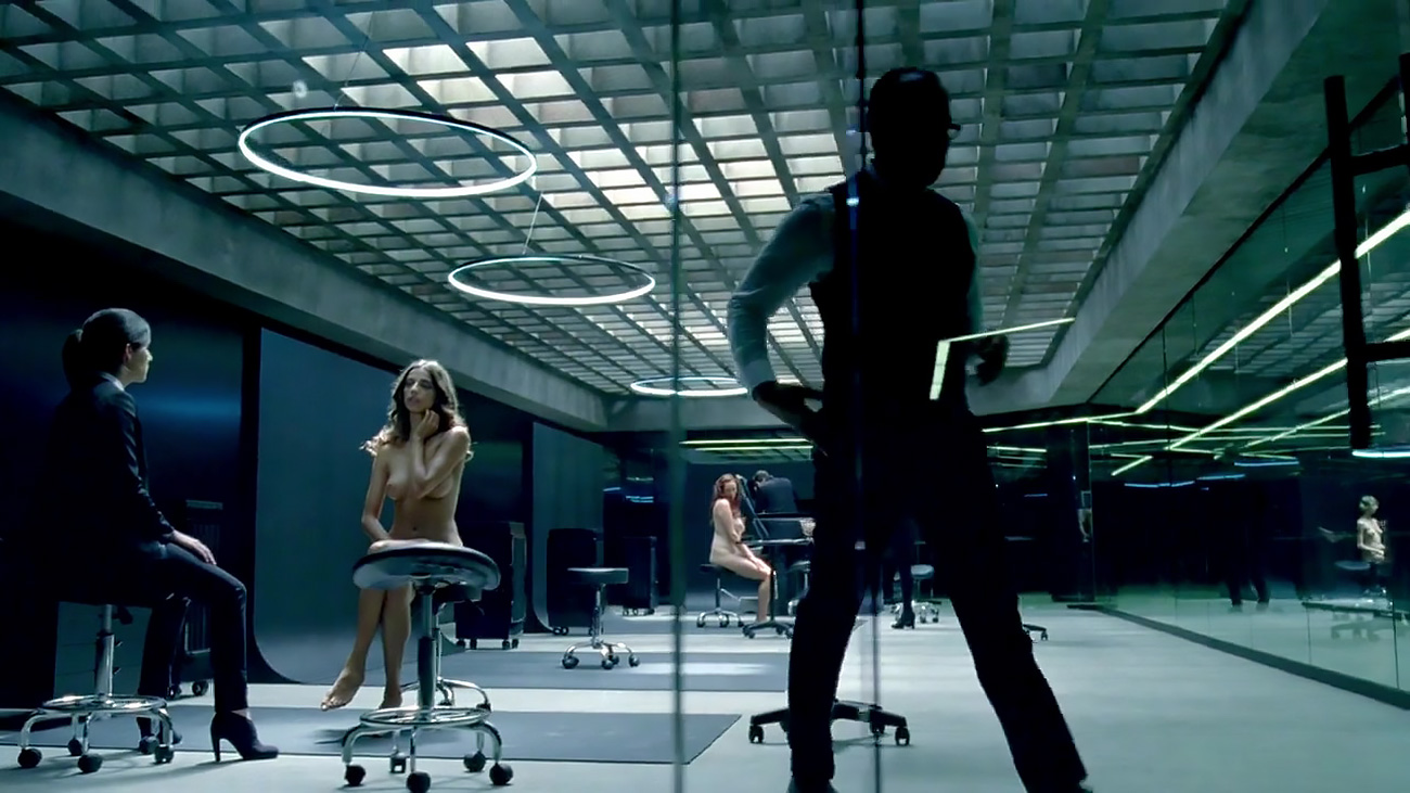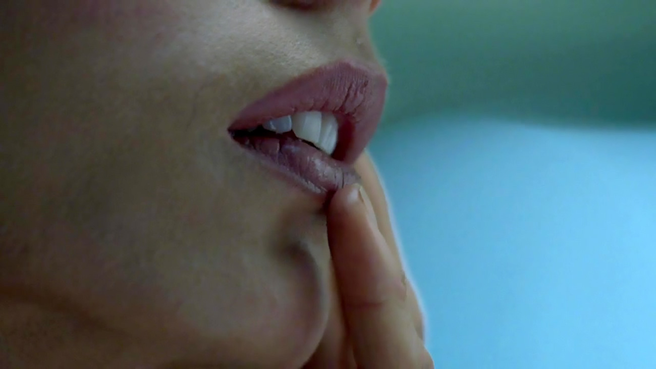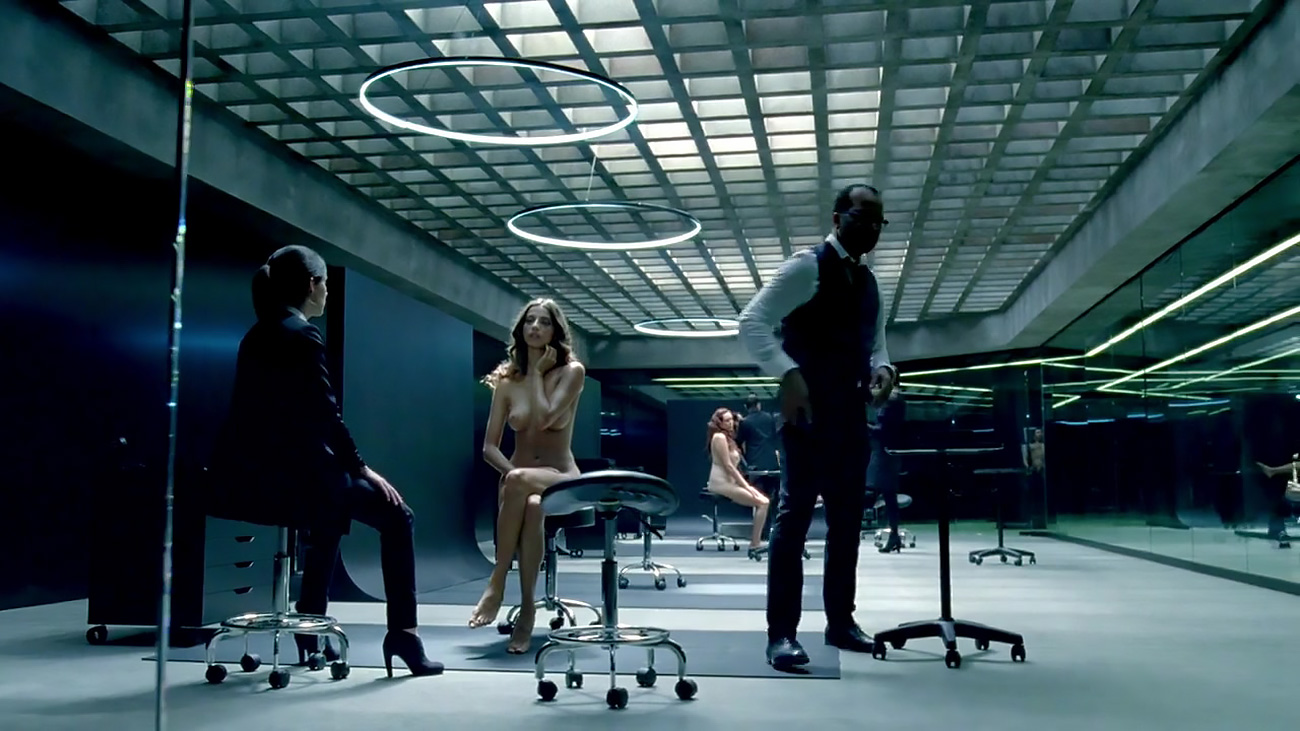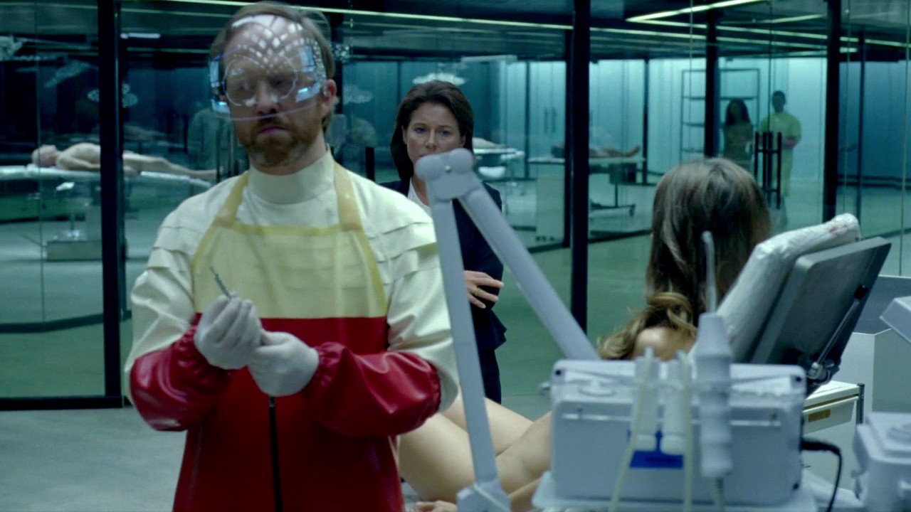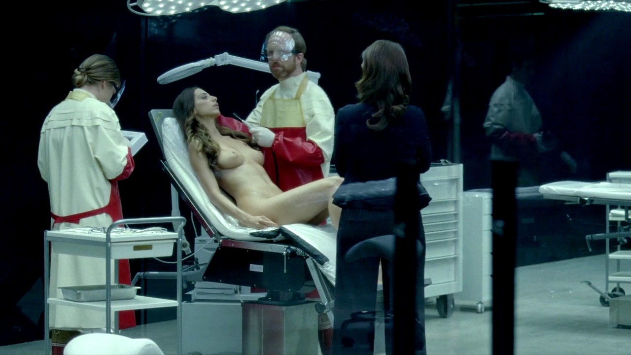 Angela Sarafyan gives us what looks like a small glimpse of the top of her bush as the camera travels past some medical equipment as she sits in a chair in a laboratory before being seen from the other side, giving us a great look at her breasts as some doctors inspect her and conduct a test as a woman watches and then exits.