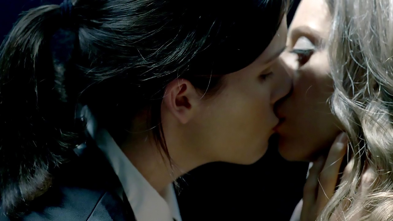 The last two scenes are from a TV series called “Westworld”. Angela Sarafyan was seated nude on a bench, revealing her right breast while holding her other hand to her chest. She remains as some girl runs her hand through Angela ‘s hair and then leans over to kiss her lesbian.