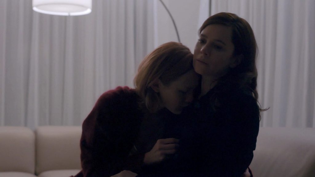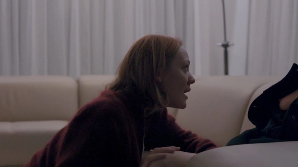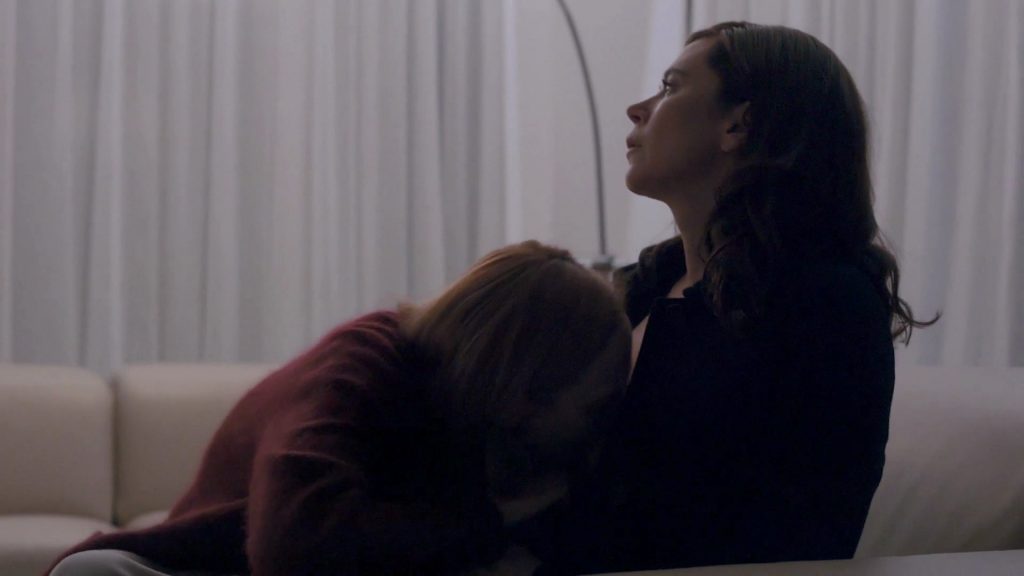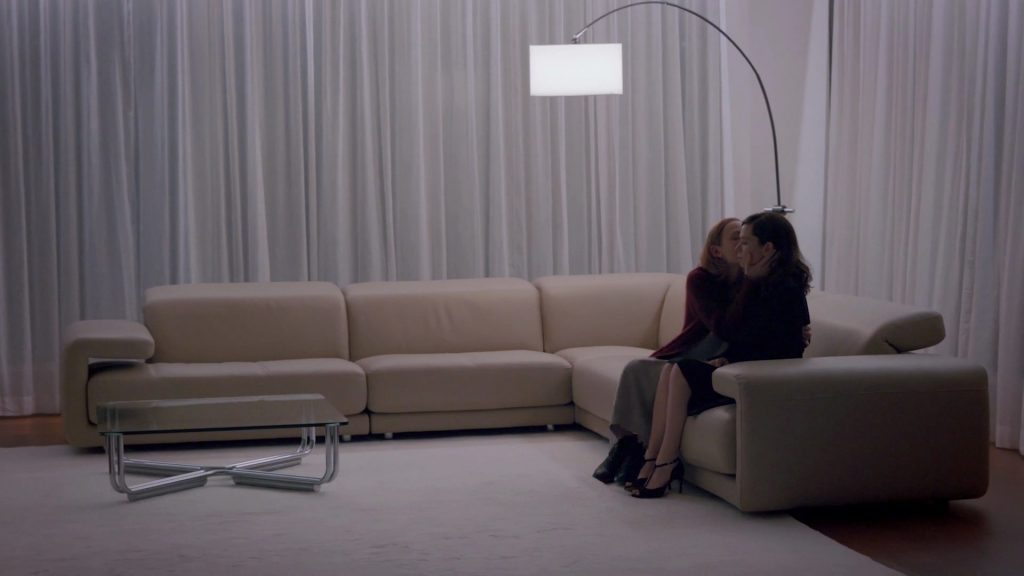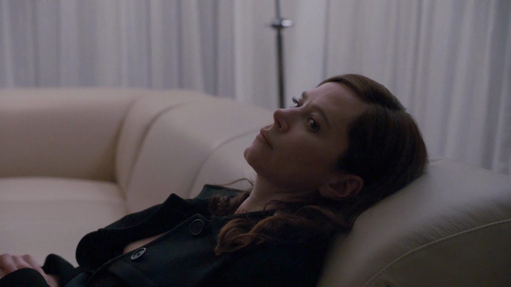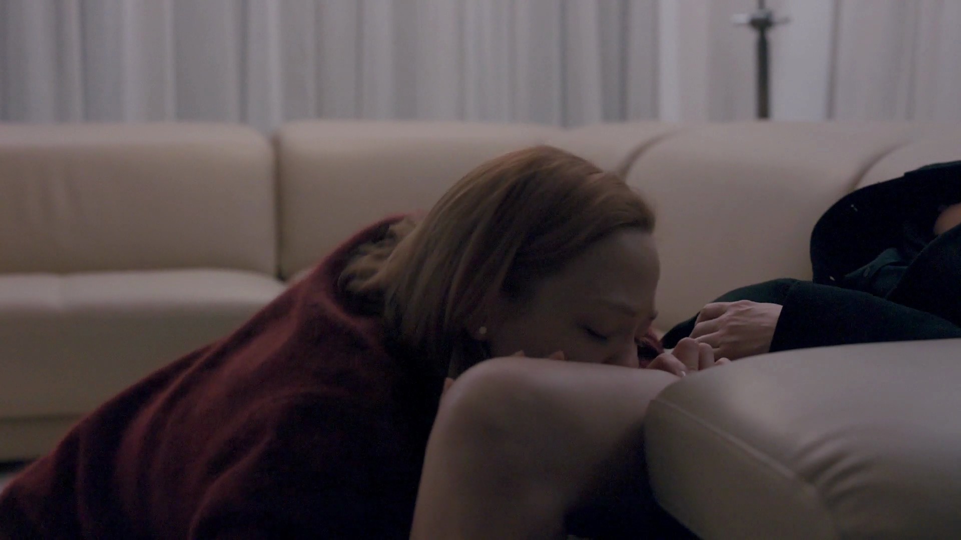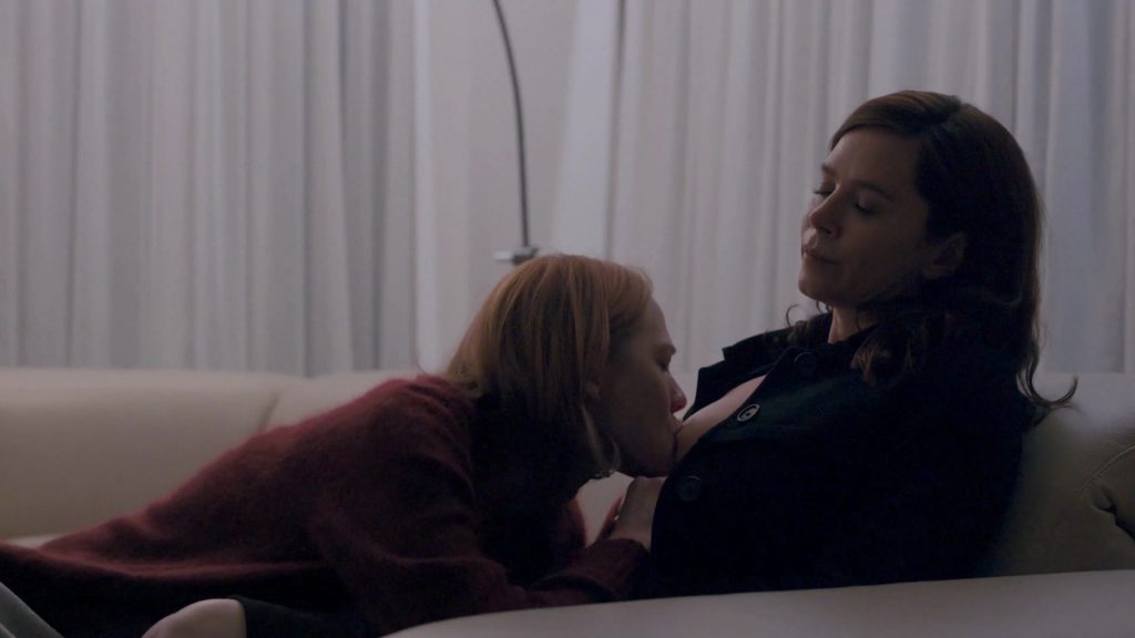 We’ve almost come to an end. This scene is from a movie called “The Girlfriend Experience”. Anna Friel sits down on a sofa while some other girl bends over to kiss her on the neck and then pulls Anna’s coat open to reveal her right breast, which she sucks. The girl then kneels in front of Anna and kisses her shoulder, and she’s about to get down on her when Anna drives her away.