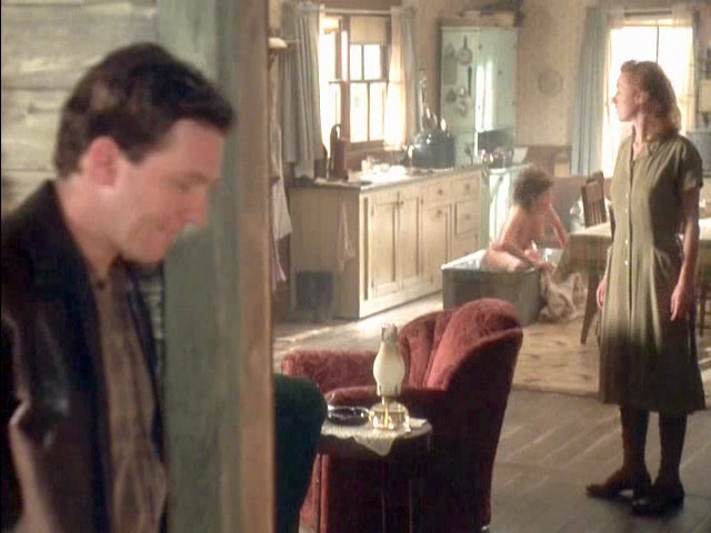 The next scene is form a movie called “The War Bride”. Anna Friel lying in a soapy metal bathtub and rubbing her breasts together a little, giving us a peek at her nipples before a guy walks in and interrupts her, and she sits down and speaks to him and Molly Parker briefly before standing up and wrapping a towel around herself.