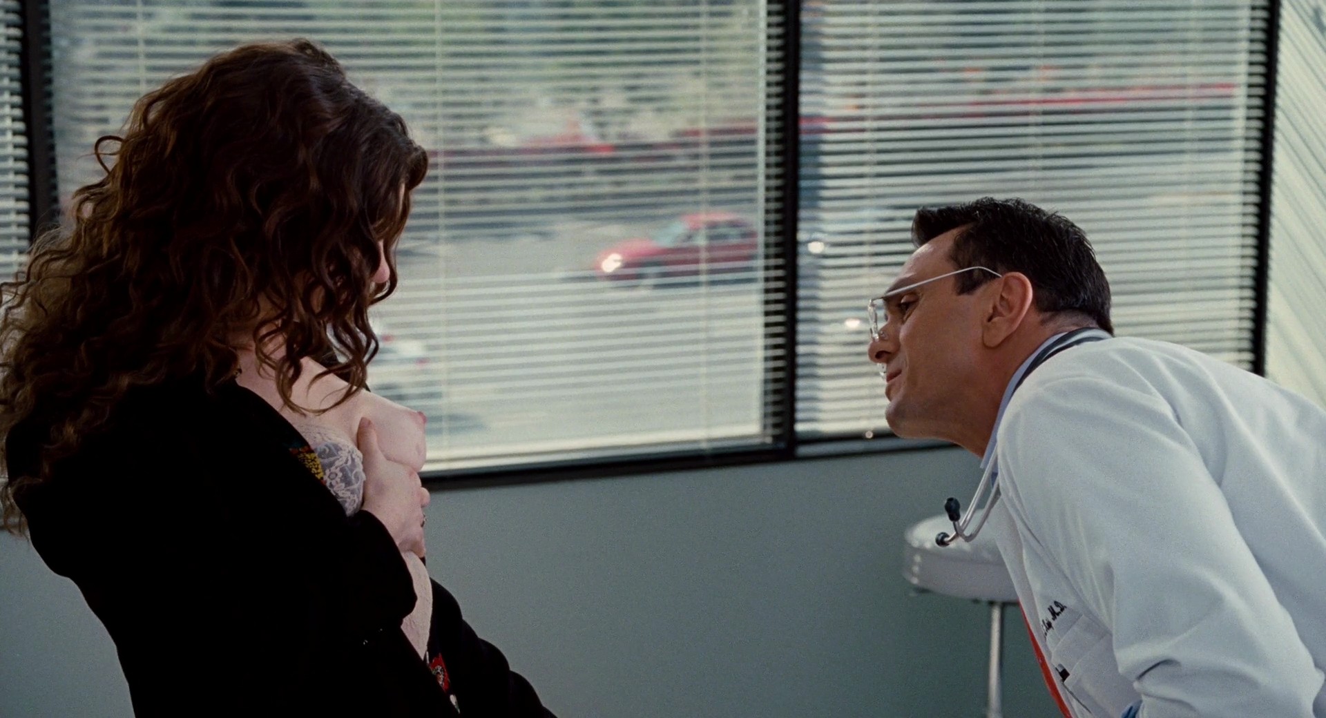 The next scene is from a movie called “Love And Other Drugs”. In this scene Anne Hathaway unbuttoned her sweater and pulled her left breast out of her bra to allow a doctor to test it with a small label. She covers her breast with her hand and Anne immediately puts her breast away when the doctor sees that the mark is just a spider bite!