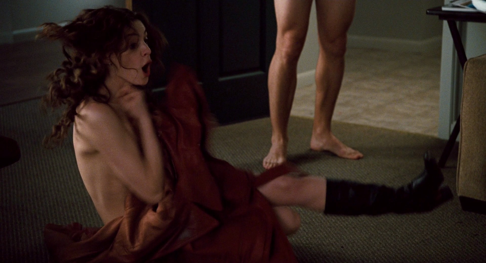 The next scene is from the same movie as the one above. In this scene Anne Hathaway is entering an apartment and dropping off her coat to reveal that she is naked underneath, she surprised some guy that is looking. She then drops to the ground hurriedly and attempts to cover up when she sees another guy sitting nearby. Then we see her in bed with that guy and they’re laying around and cuddling!