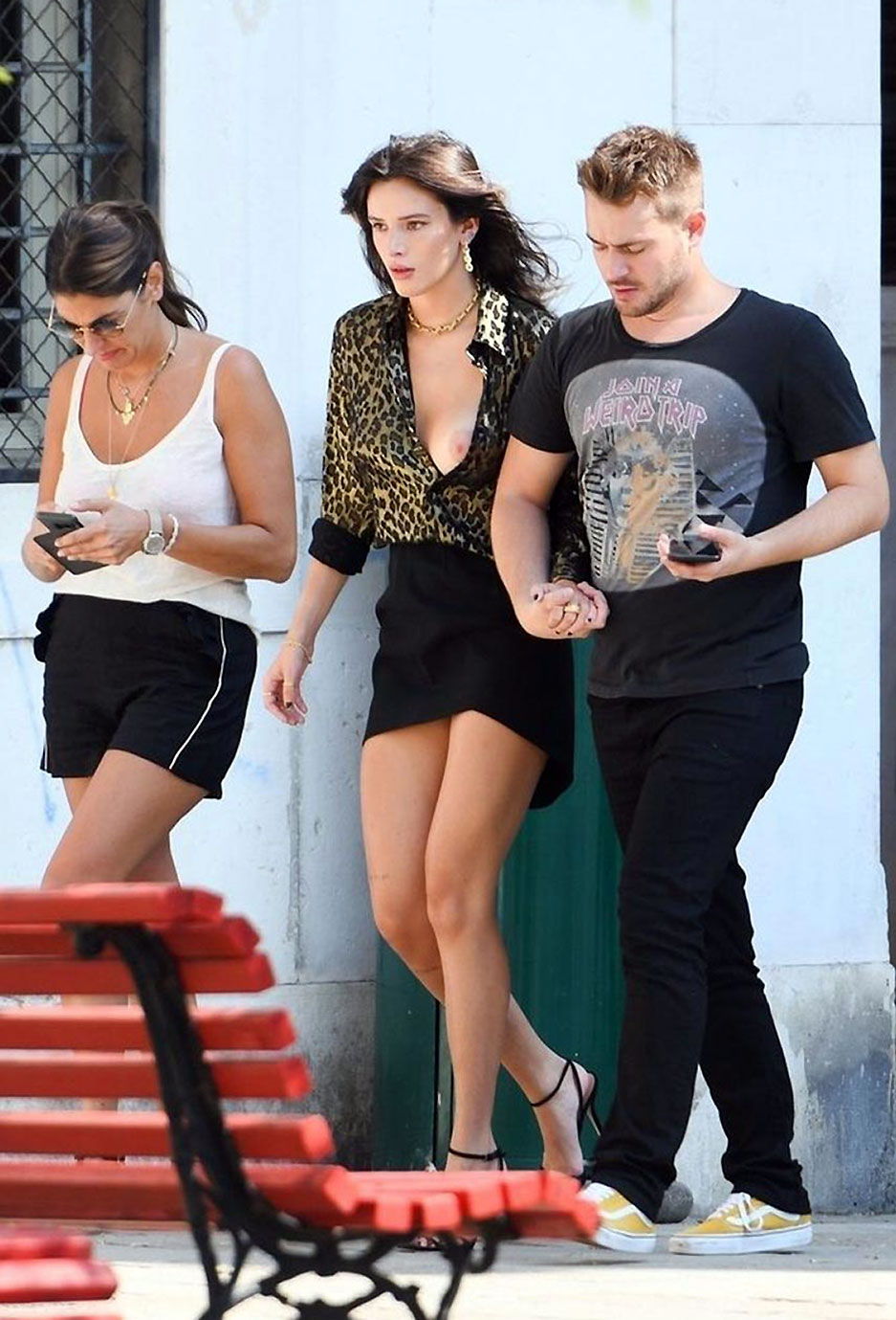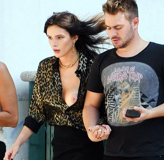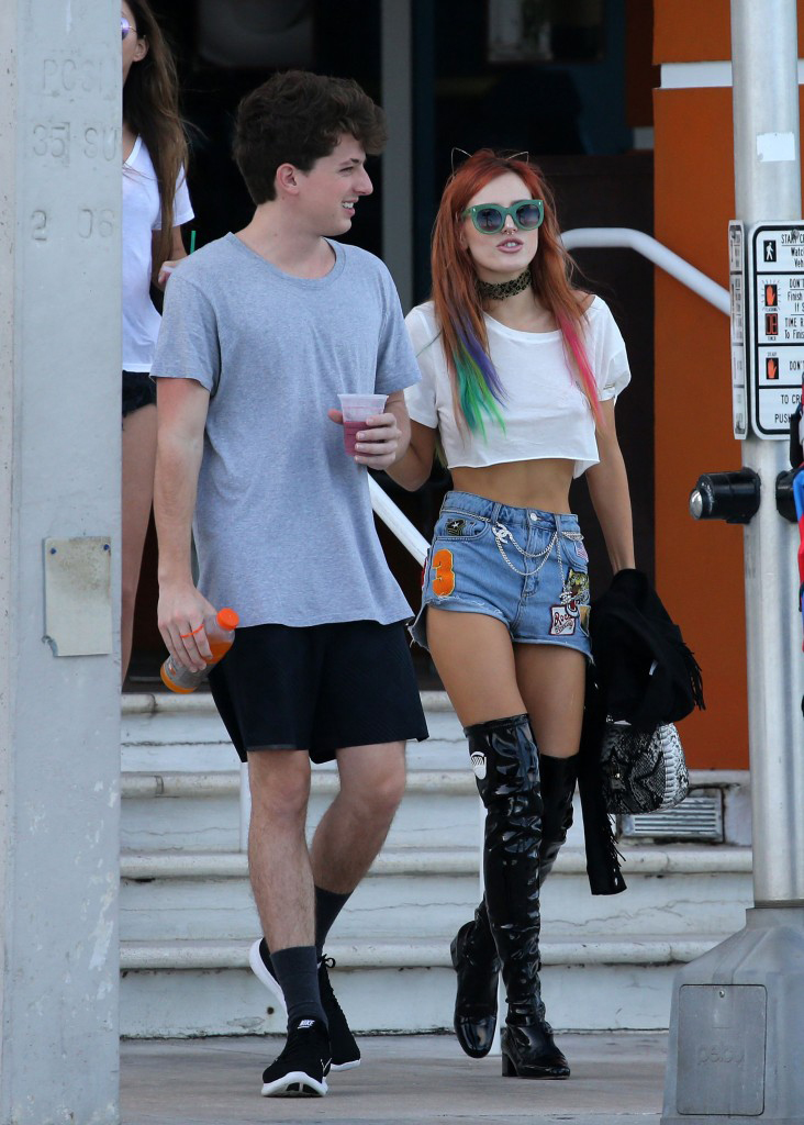 The young star, Bella Thorne, caught up with her new boyfriend cuddling on the beach. She wore a tiny crop top which in one moment almost revealed more than it should, and we sure hoped it would. On the bottom part she wore also a tiny denim shorts and deep boots, not quite an outfit for the beach. She was with her new boyfriend which was dressed more appropriate for the beach in grey t-shirt and black shorts.