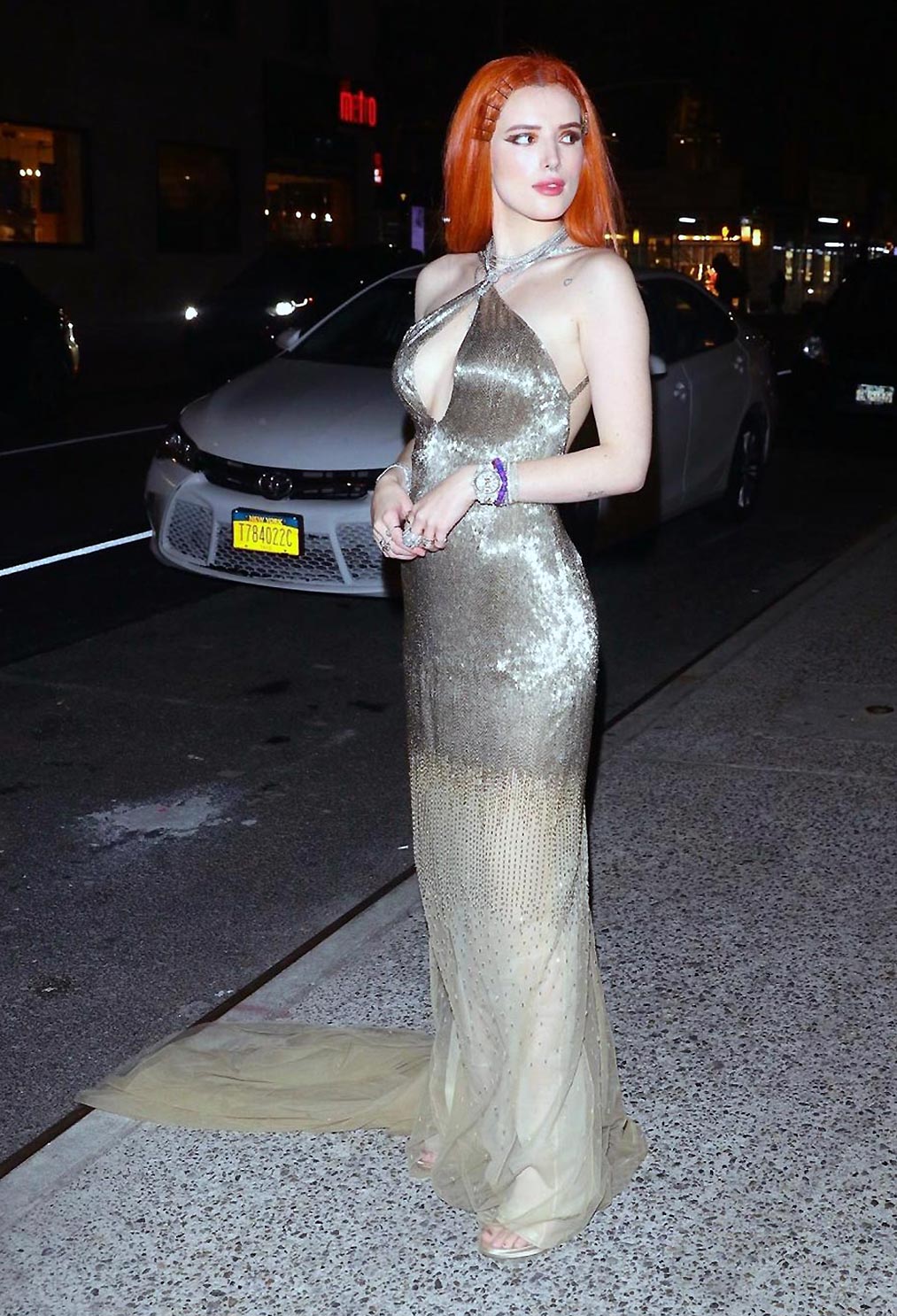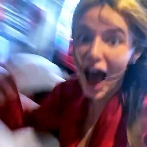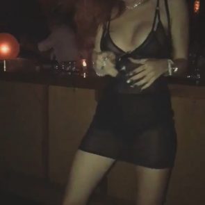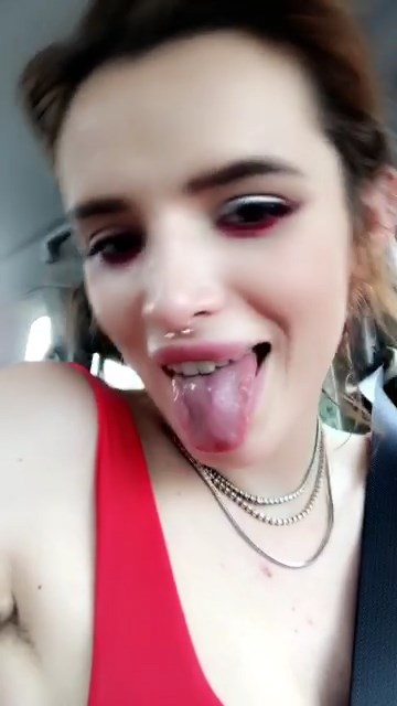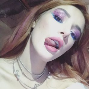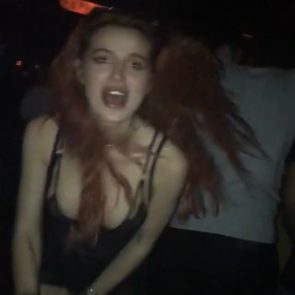 Thorne is a 21-year-old slut, who started to post her see-through and slightly naked pics when she turned out 18. This whore is an actress and singer, but most popular for her Snapchat account, where she’s proudly posting her private stuff, live videos, and stories. Bella even shared a lesbian kiss with her friend two years ago. She is always dirty, full of glitter, and has done several nose jobs. This Bella Thorne porn video above appears at the same time as other leaked photos from the same night. In them, we can see Bella dancing drunk and revealing a lot of skin. She’s the junkie!