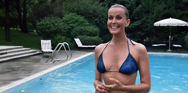 Bo Derek sunbathing topless on a sailboat’s deck before getting up to take off her underwear and expose her bush before diving fully naked off the edge of the boat into the sea below.