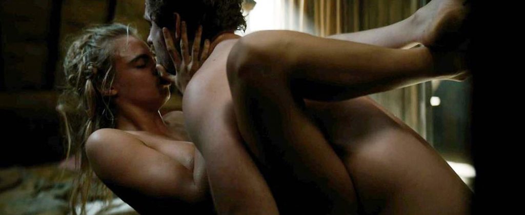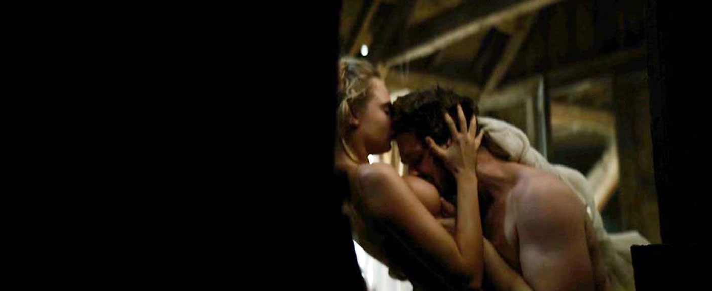 The last scene for today is from a movie called “Tulip Fever”. In this scene we see Cara Delevingne in a man ‘s lap while she takes off her dress over her head and bares her breasts, which the man bends over to suck on as she and the guy are having sex with Cara ‘s legs wrapped around him.