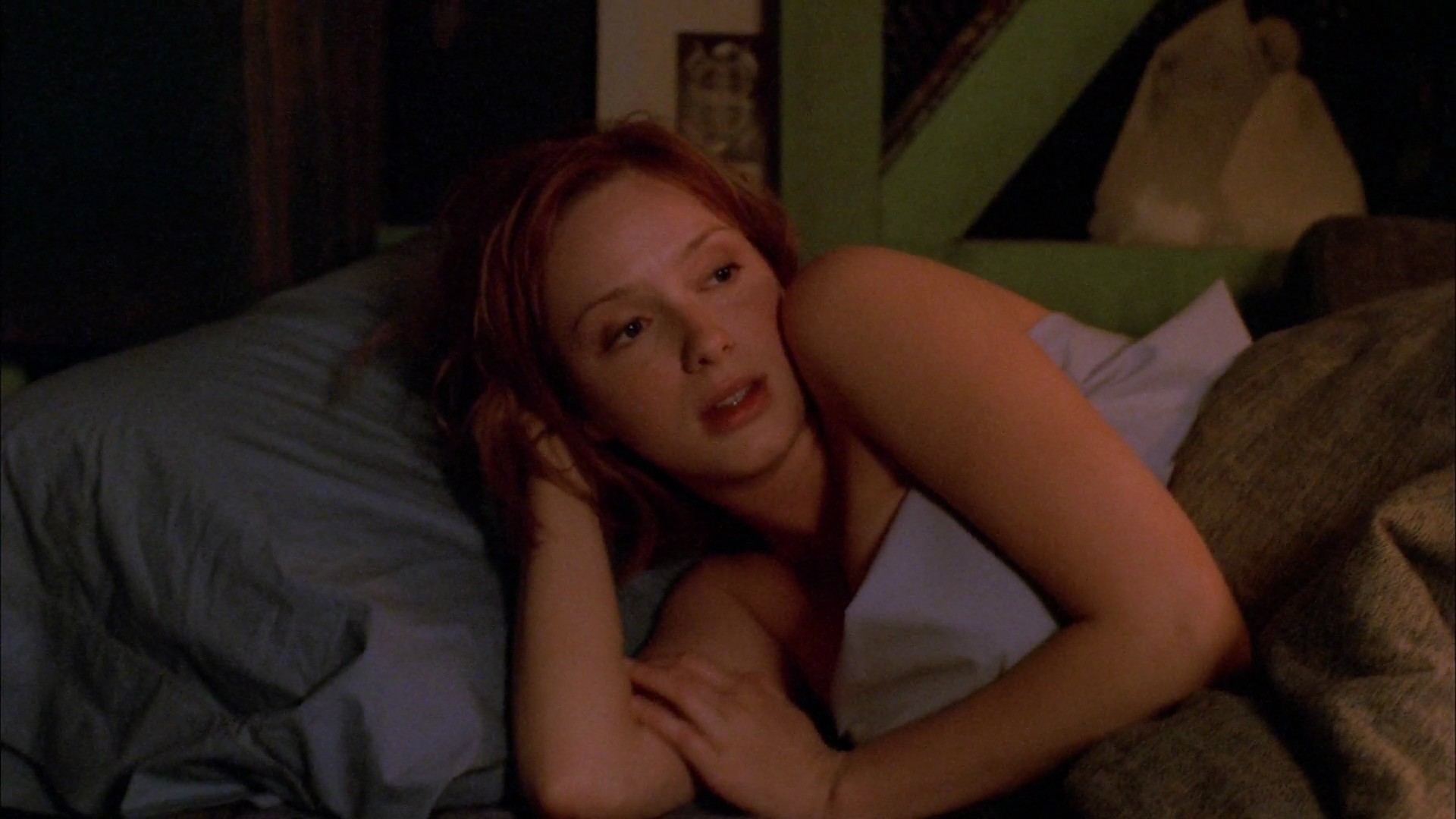 In the next scene Christina Hendricks is sitting naked in her bed with a cover up her face, talking to a man. Then she lowers her covers, almost exposing her breasts as she’s still sitting on the bed, and the guy takes his eyes off. For a moment, she’s standing up and hugging him.