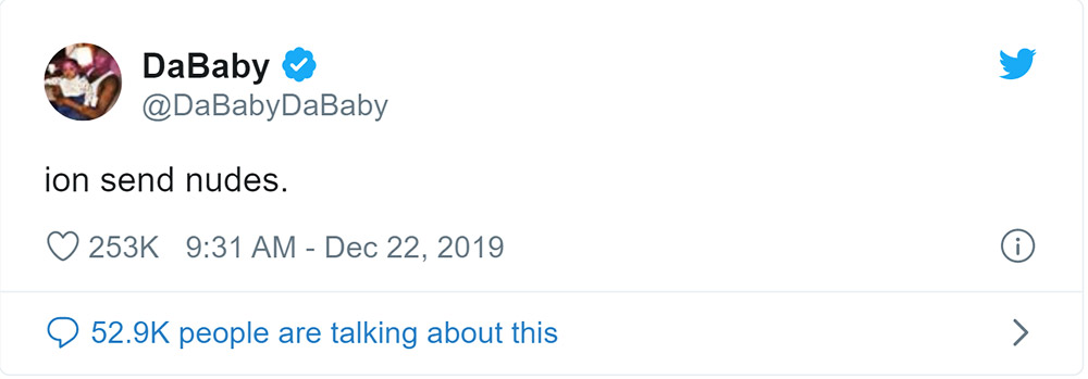 “Ion send nudes,” DaBaby posted on his Twitter a morning after. It supposed to be believed in to his words, but who knows fellas. Maybe he’s lying as fuck.