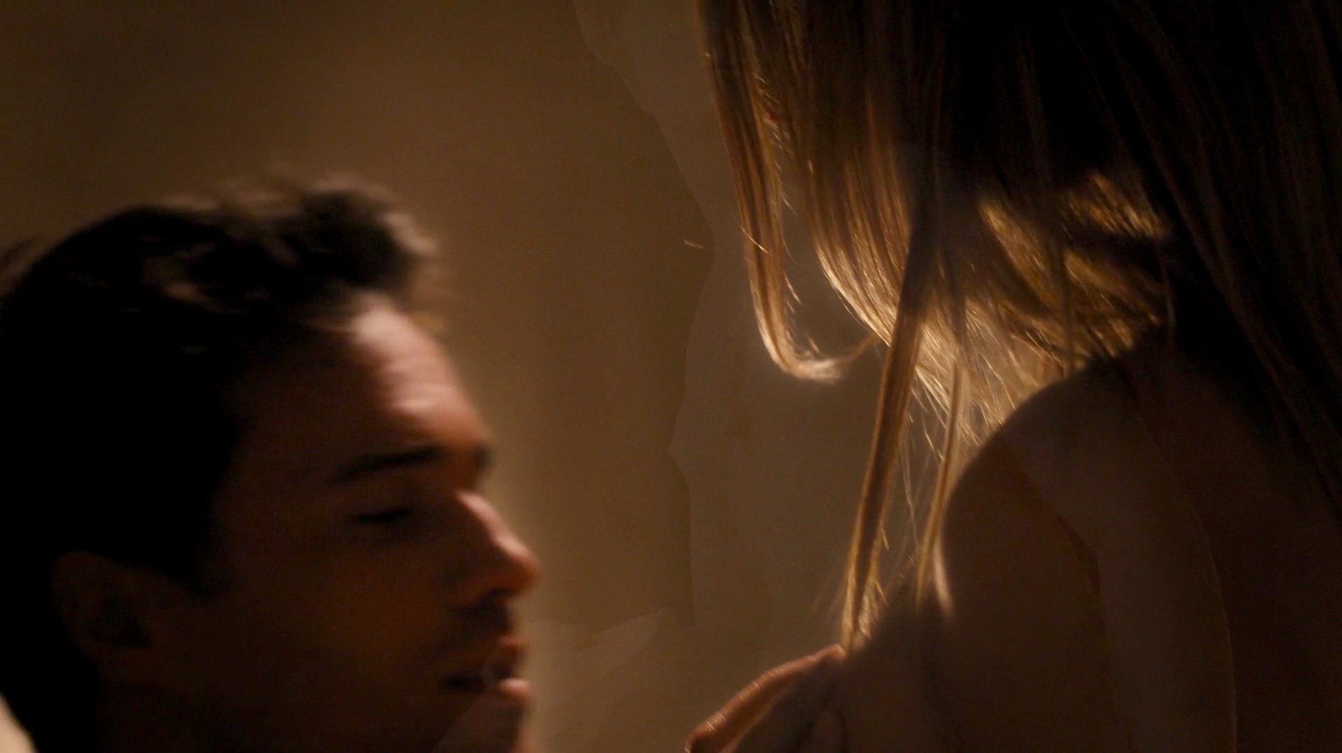 The first scene for today is from a movie called “Lost In Florence”. In this scene Emily Atack is watching a man place his hand on her left breast as she sits on a bed in his lap, almost exposing her nipple as the man pulls away his hand and bends forward to press her breast against his chest while she kisses him!