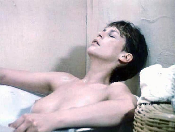 Jamie Lee Curtis is seen topless in a bathtub, her breasts visible above the water, reading a letter. Then we find her in bed, topless, having sex with a man, first on her back and then on her stomach, while the guy has sex with her from behind.