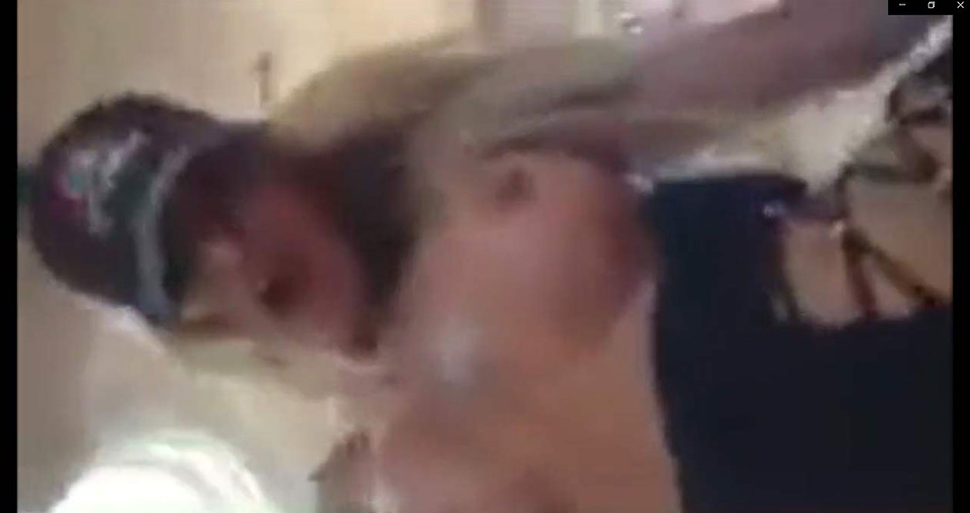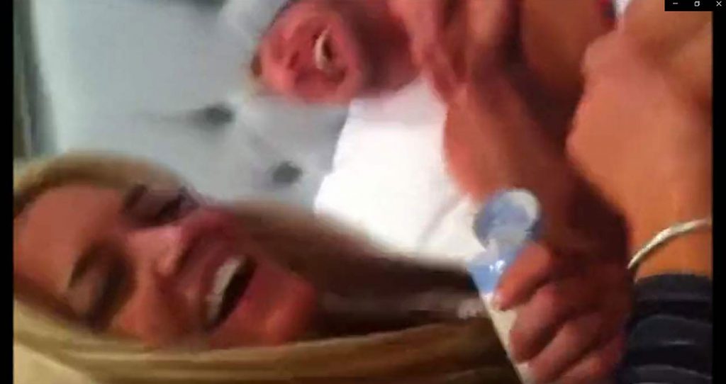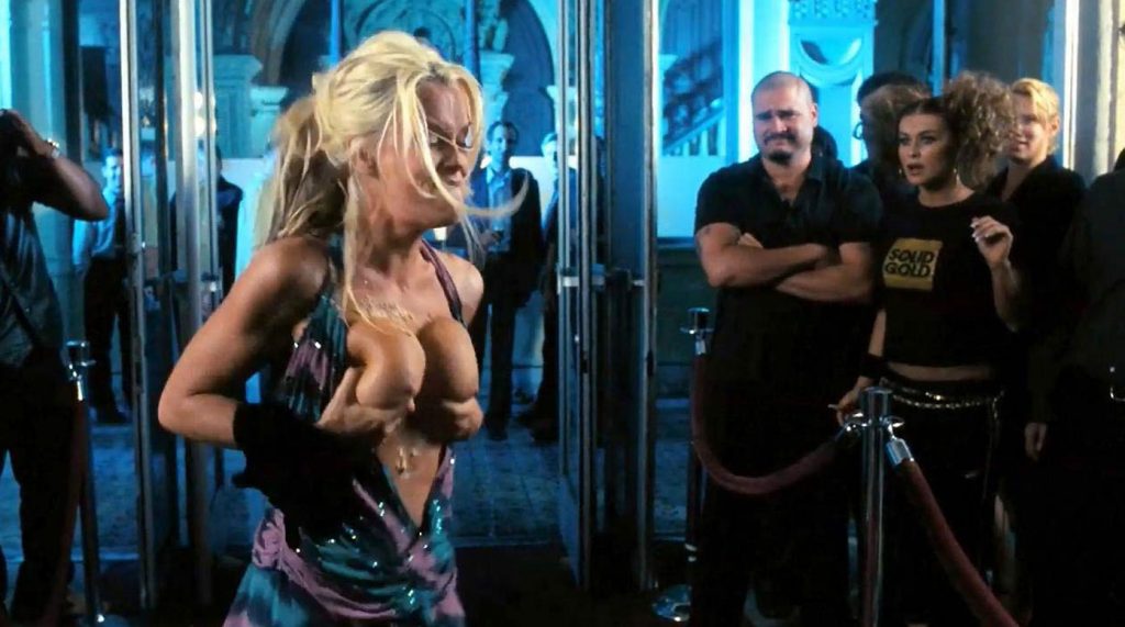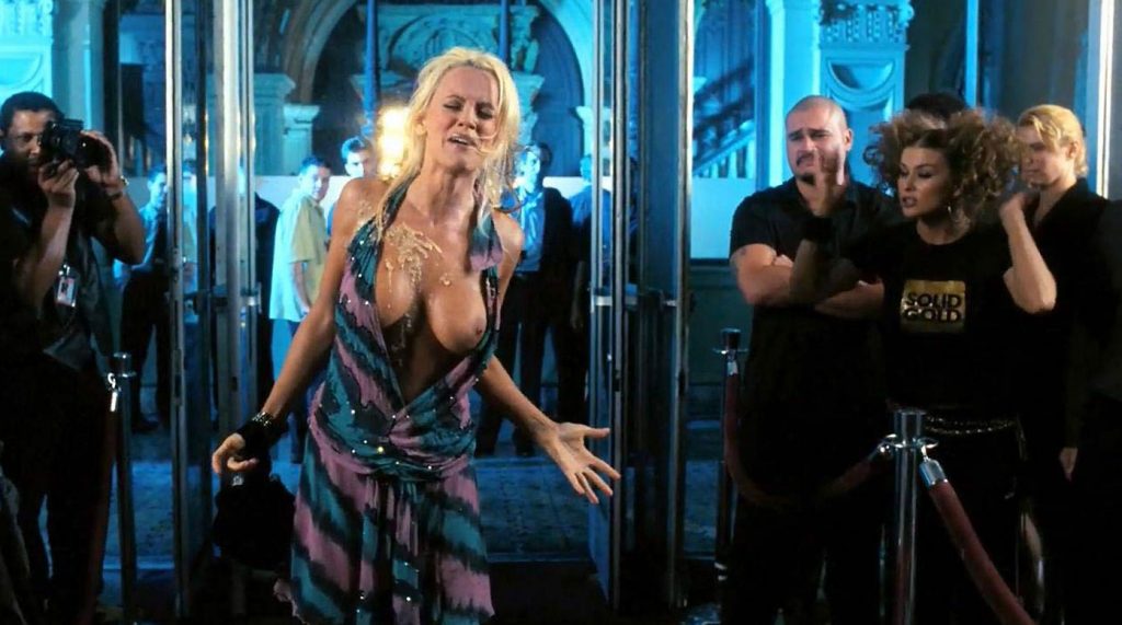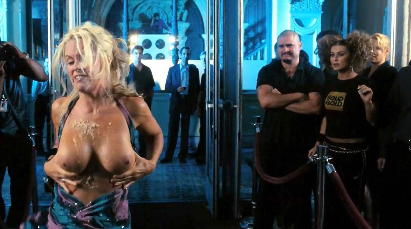 This first scene is from a movie called “Dirty Love”. In this scene some guy threw up on Jenny McCarthy chest, and she’s making a scene about it! When she realises her left boob slipped out of her dress a little bit, she took both of her boobs out rubbing them against each other while some crowd around watches!