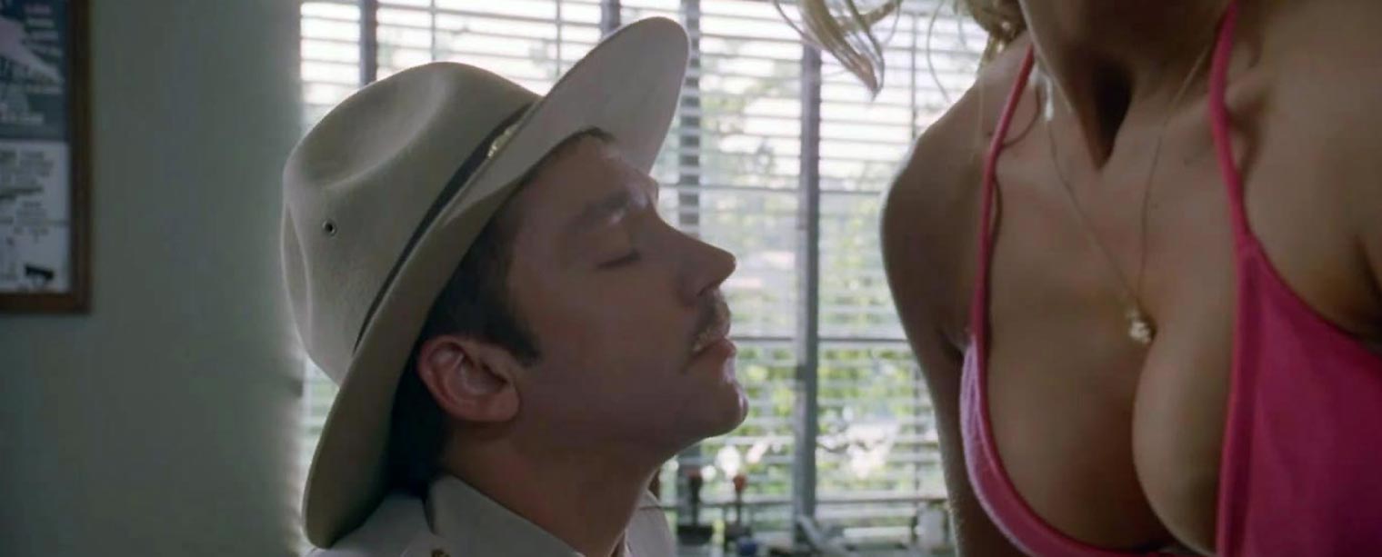 Here is the second scene from the film ‘The Dukes of Hazzard.’ Jessica Simpson shows off her beautiful cleavage while greeting a guy at his desk in a pink bikini, then bends in to reveal her huge tits.