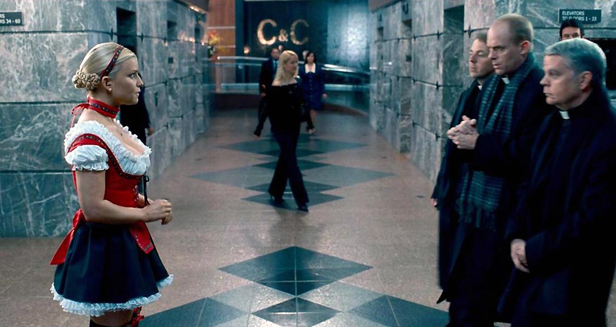 The last scene I’d like to show you is from the film ‘Blonde Ambition.’ Jessica Simpson greets some men in a building lobby while wearing a sexy beer wench outfit that shows off her cleavage. After a brief conversation, we see Jessica pouring drinks and then sitting at a table in a cafe, still dressed in the same dress.