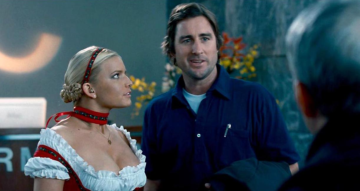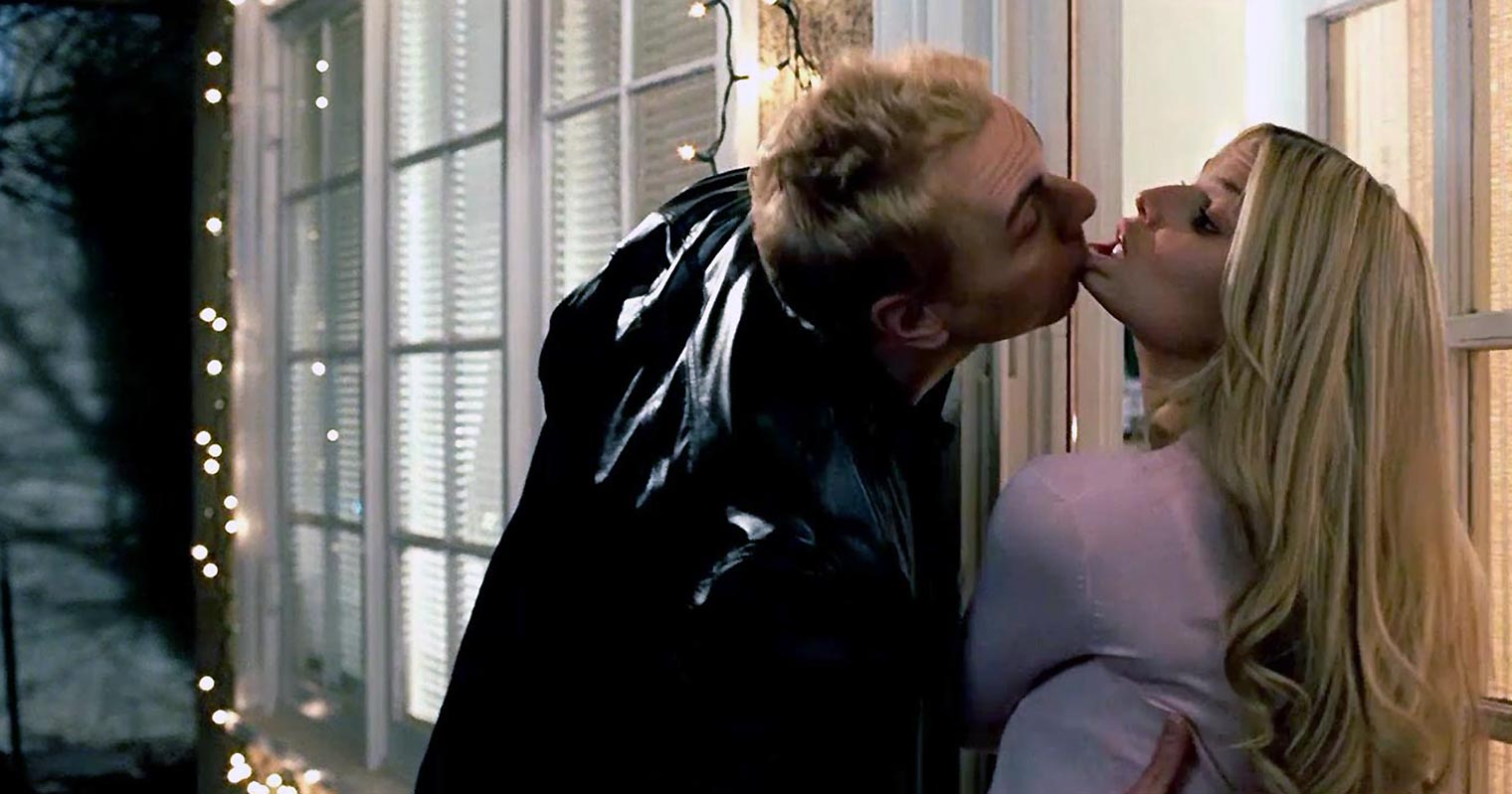 The following scene is from the film ‘Employee Of The Month.’ In this scene, we see Jessica Simpson talking with a man on a porch. He awkwardly kisses her and pulls on her bottom lip as she walks down, then goes inside and shuts the door.