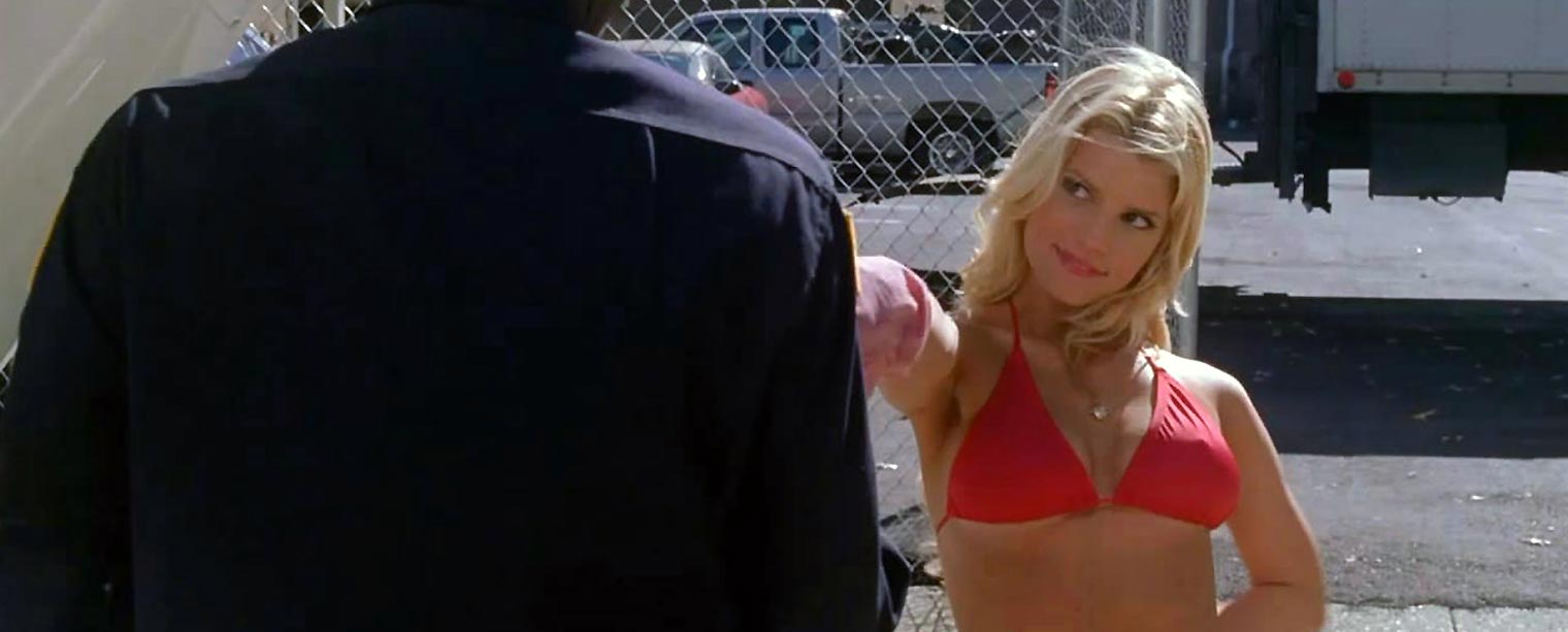 Remember ‘The Dukes of Hazzard’ movie? Well, the first two scenes are from it! Jessica Simpson, dressed in short denim shorts and a red bikini top, bent down in the first scene, pleading with a pair of police officers to help her with her motorcycle.