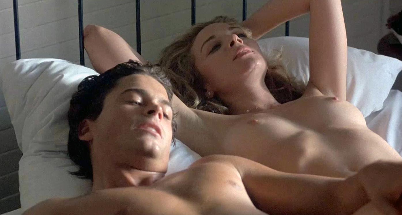 The last scene is from a movie called “Masquerade”. Kim Cattrall is nude and rolled over in bed next to a man, exposing her breasts as she breathes deeply after intercourse. When the man gets out of bed, Kim stands up and tosses her a wrapped present. When she sits cross-legged and unwraps a pair of lace trousers, we can see her breasts.