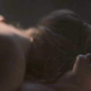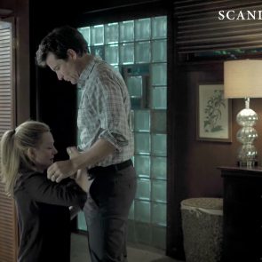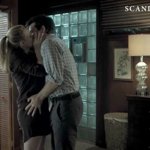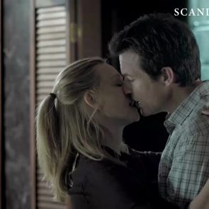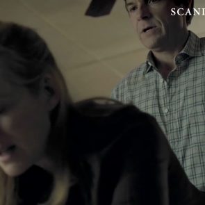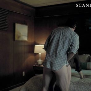 The next scene is from the famous TV series called “Ozark”. In this scene we see Laura Linney kissing with a man as they stand. She then gets down on her knees and unzips his pants. She starts blowing him, and after a while he picks her up and starts pounding her doggy style on the bed!