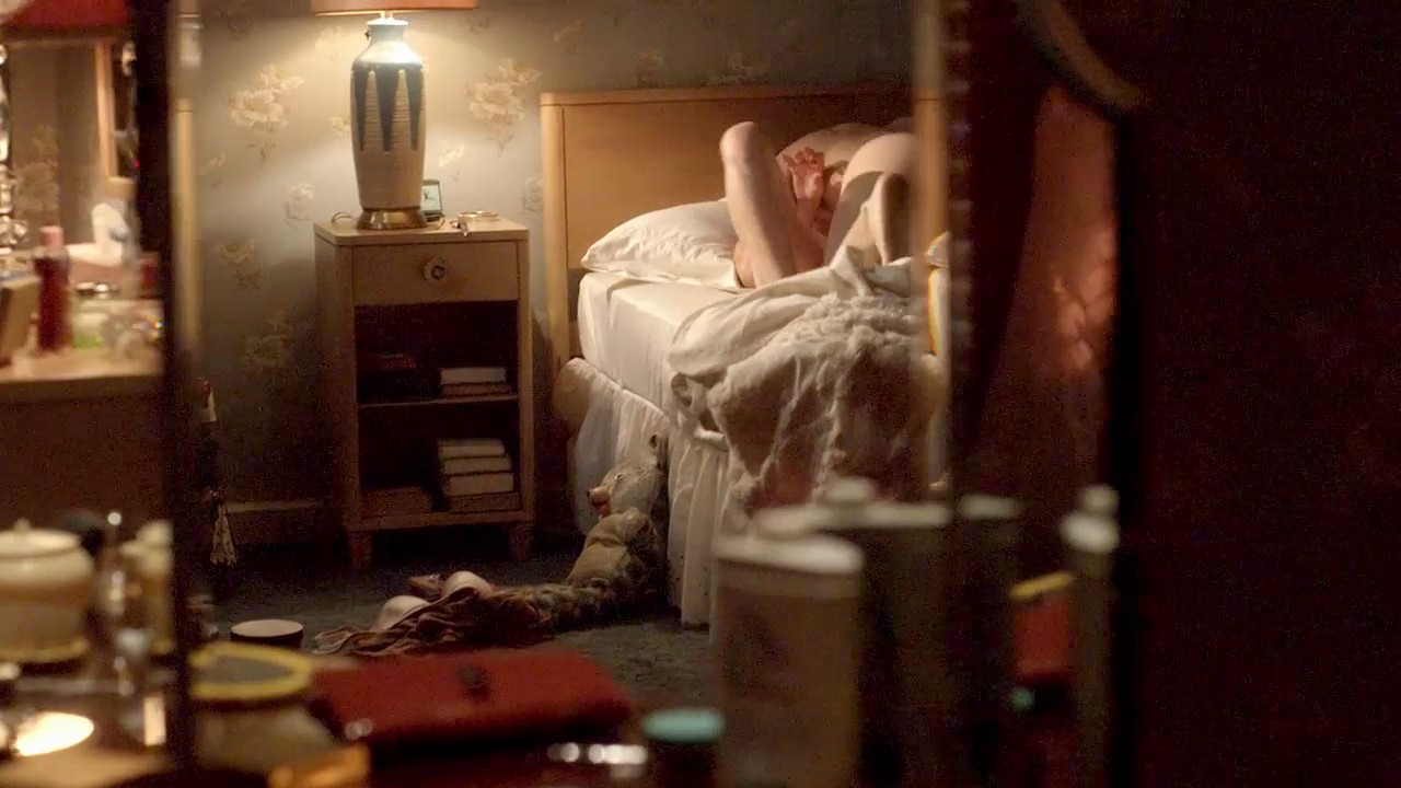 The fist scene is from a TV show called “Masters Of Sex”. In this scene we see Lizzy Caplan naked fully while she’s in bed with some guy. They’re having sex, and Lizzy seems to enjoy it very much! We can see her titties clearly, as well as her hard nipples!