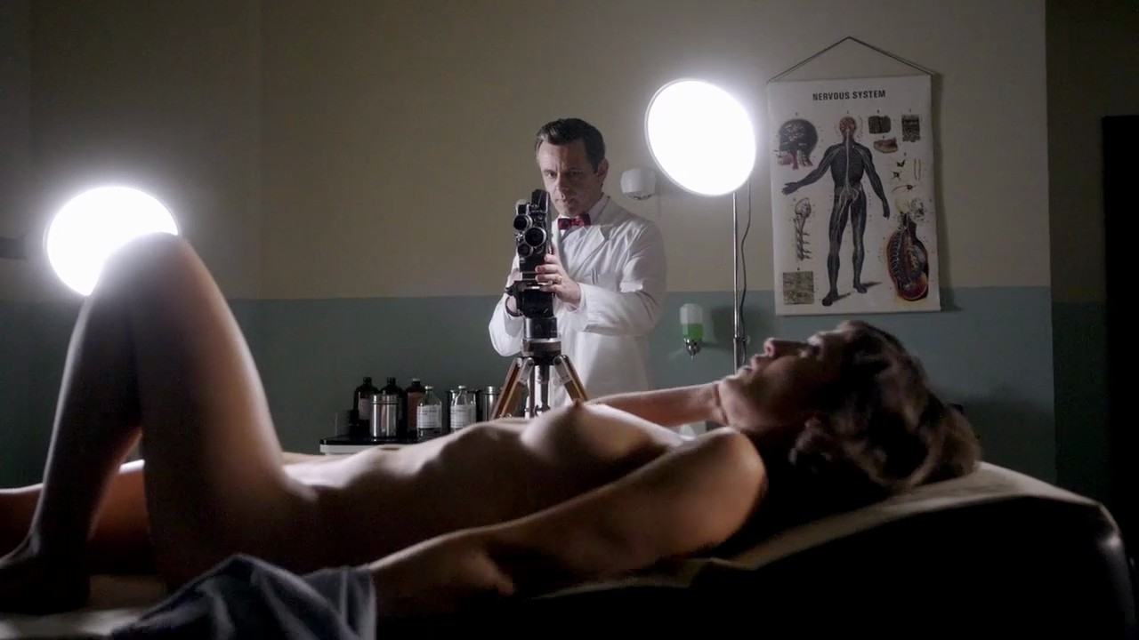 The next scene is from the same TV show as the one above. In this scene we see Lizzy Caplan fully naked, as she gets up on a table to lay on it. She’s in some laboratory, and a guy is filming her as she plays with herself!