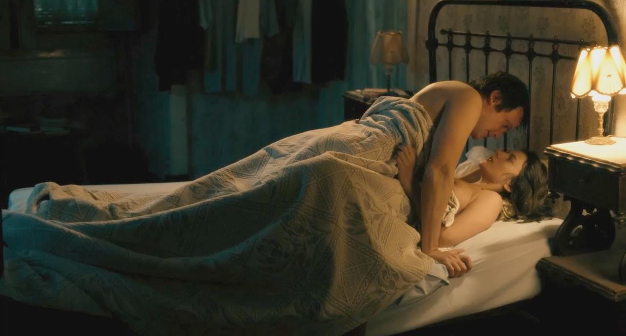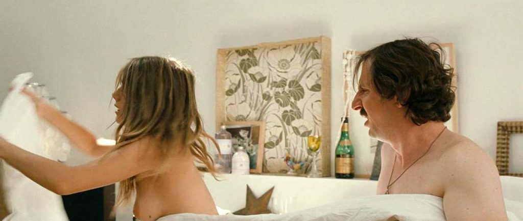Now Mélanie Laurent is lying underneath a guy on a bed again, and showing her tits in a scene from ‘Night Train to Lisbon’.