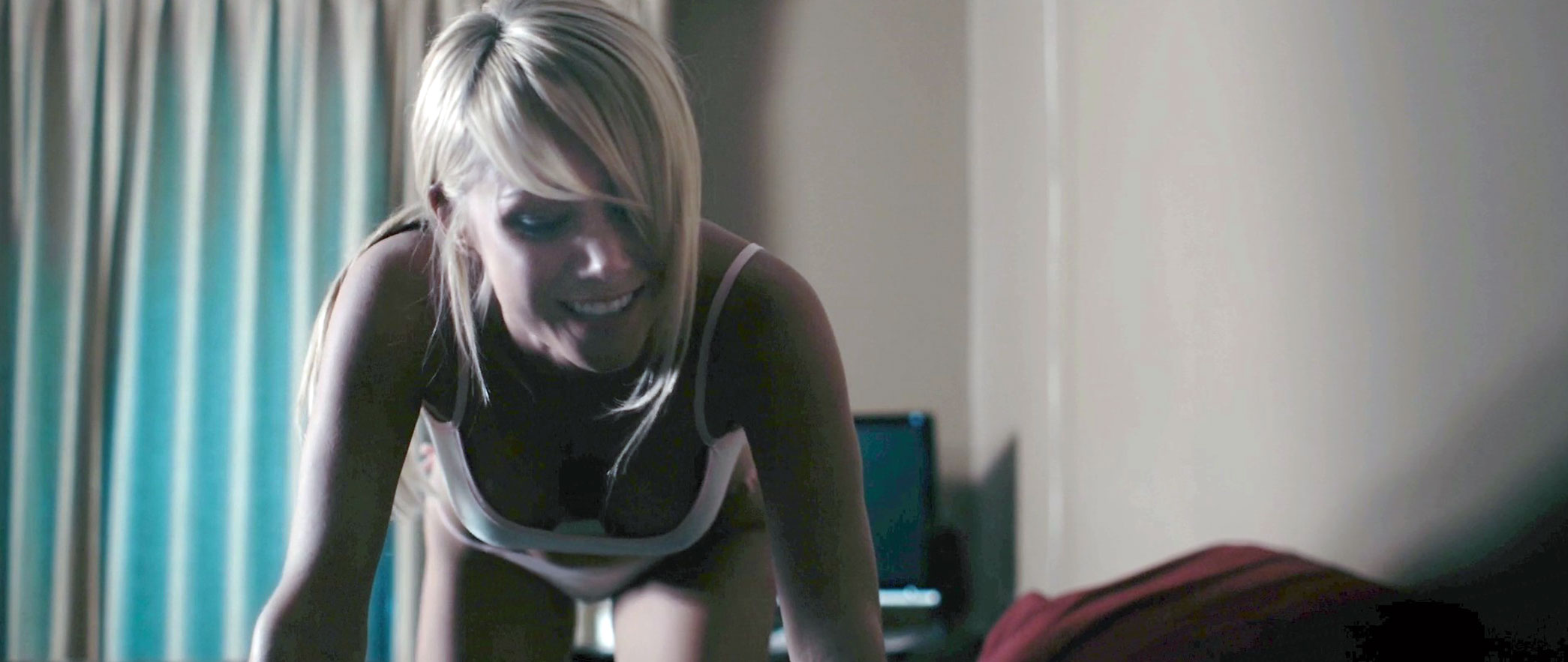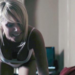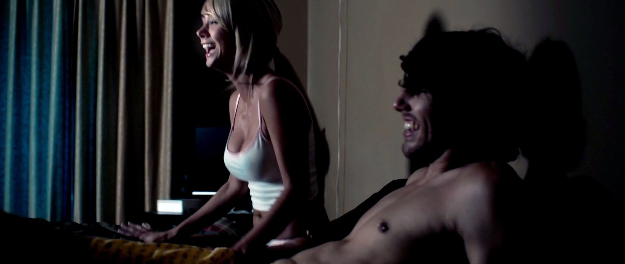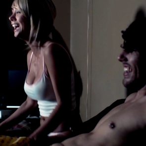 In this scene, we see Sara Jean Underwood sitting in a braless bed in a tight white tank top that shows her dark left nipple below. She’s screaming at a movie, and then she pushes a guy as she sits down on her knees. She’s giving us a very dark look at her cleavage, and she’s finally lying on her back in her panties talking to him until they start kissing her.