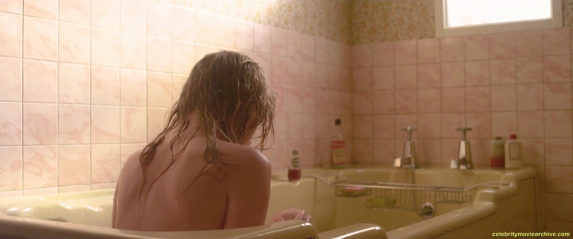 The first scene is from a movie called “Rachel”. In this scene we see Suki Waterhouse as she climbs nude into the bath, revealing the side of her breast, and then sinks into the water while she gradually starts to masturbate and grips her breasts, displaying her left nipple while she moans louder and louder, before she eventually orgasms all the while various people knock on the door and call out to her.