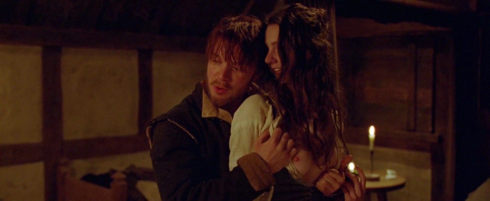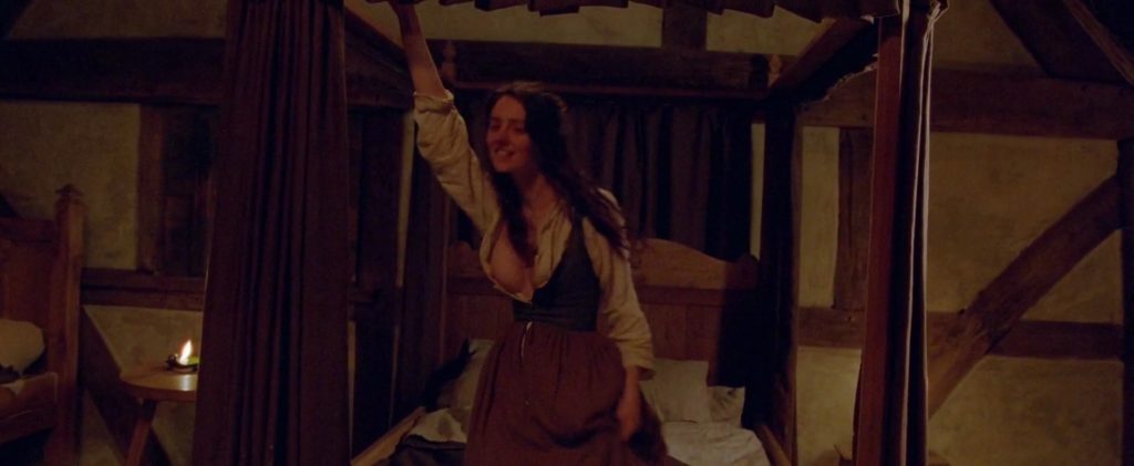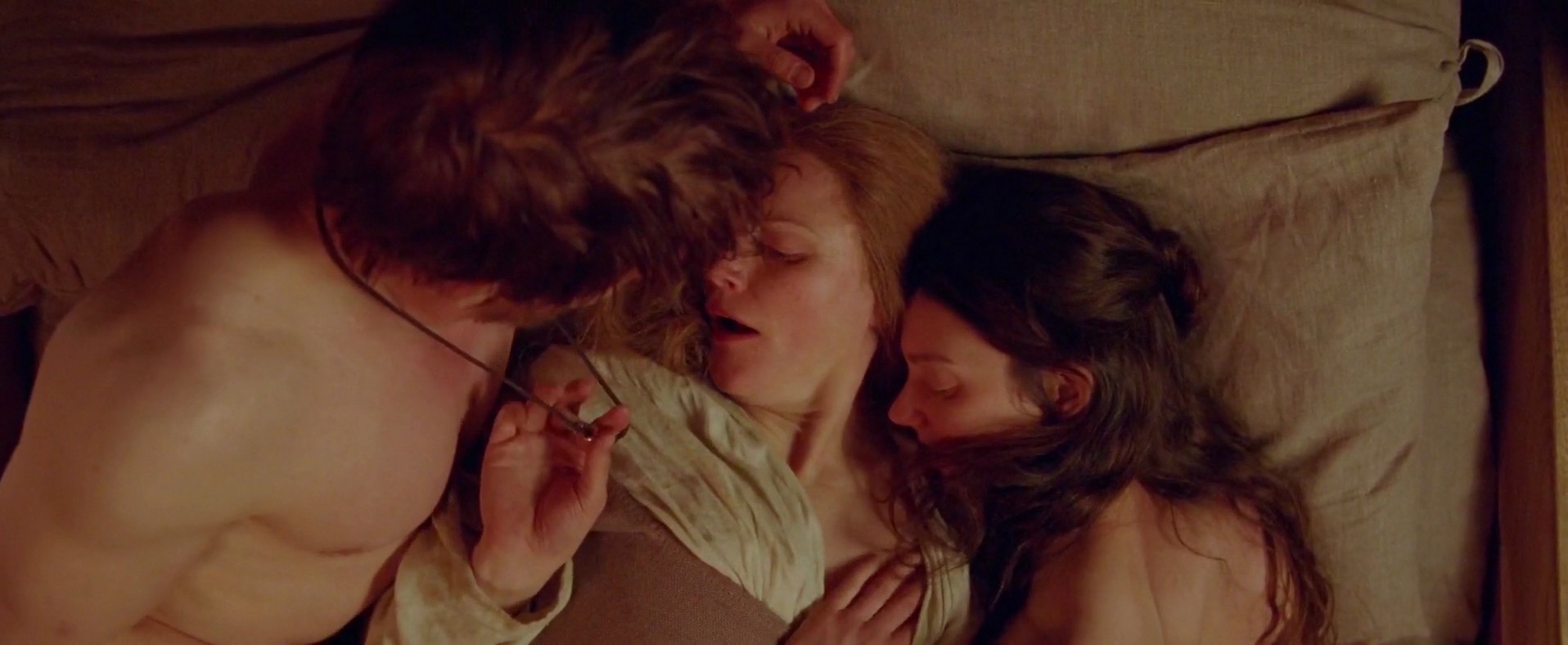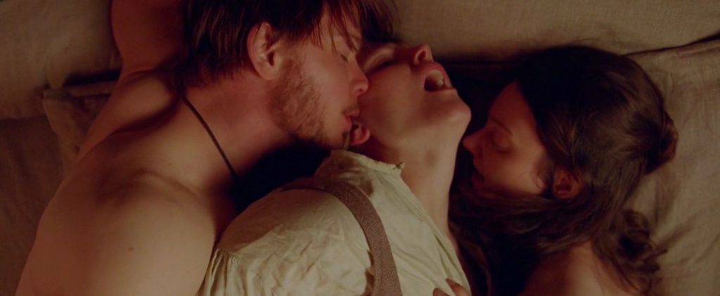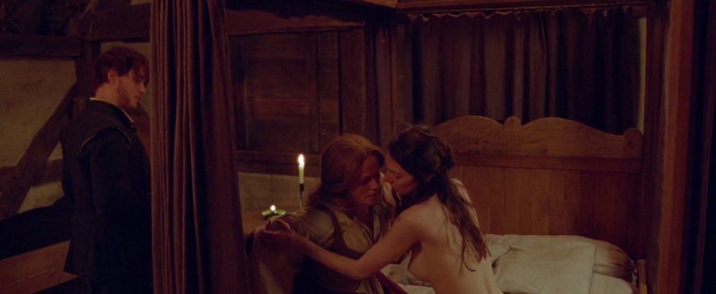 The next two scenes are from a movie called “Fanny Lye Deliver’d”. Tanya Reynolds, standing by the bed as some man, pulls her dress from behind and squeezes her exposed breast as two folks stare at her. Tanya then strips down completely nude, lying on the bed with her breasts and a bush in sight. l One of the girls follows her in the room, and Tanya kisses her. The first man joins them, and they’re lying with Maxine in the middle between Tanya and the man.