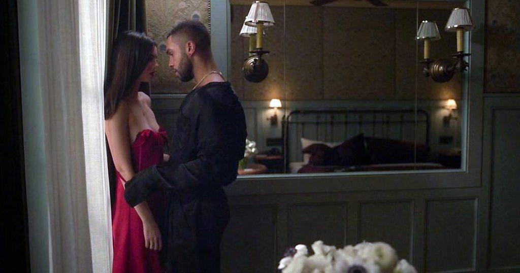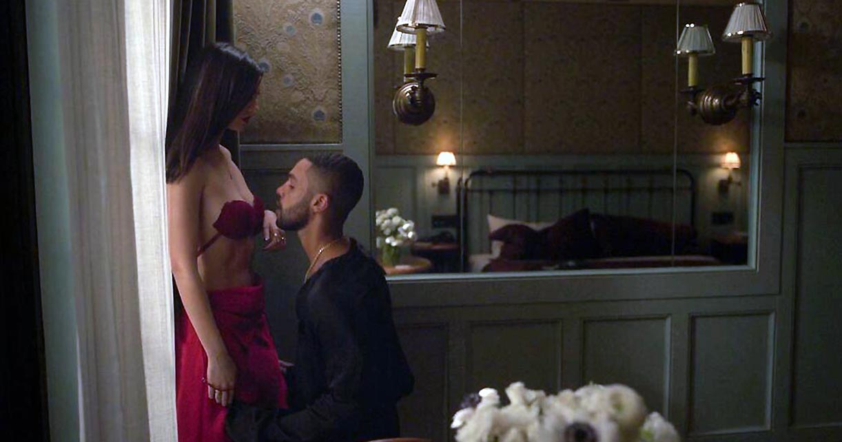 Victoria Justice has a man lower her dress to the floor as she stands against a wall, exposing a red bra and panties underneath.