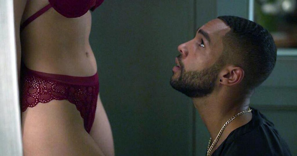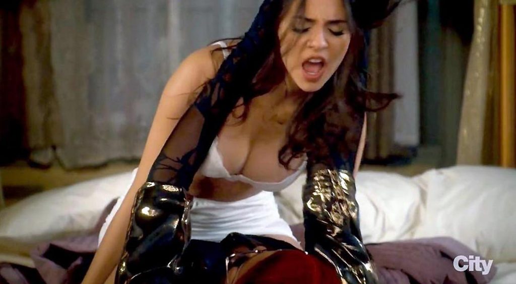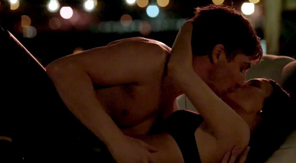 Victoria Justice happily making love to a guy late at night on a rooftop, then watching him pick her up and put her in his lap, lifting her dress to expose a bra as she jumps on top of him as he grabs her ass through her tight leather pants and then tips her over, giving us a better peek at her cleavage as they kiss.