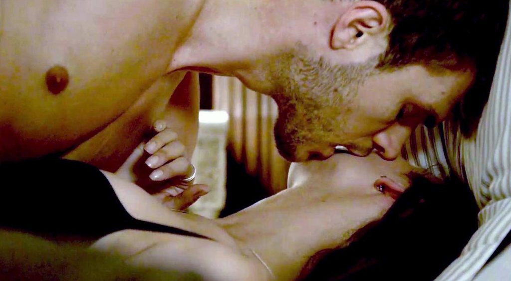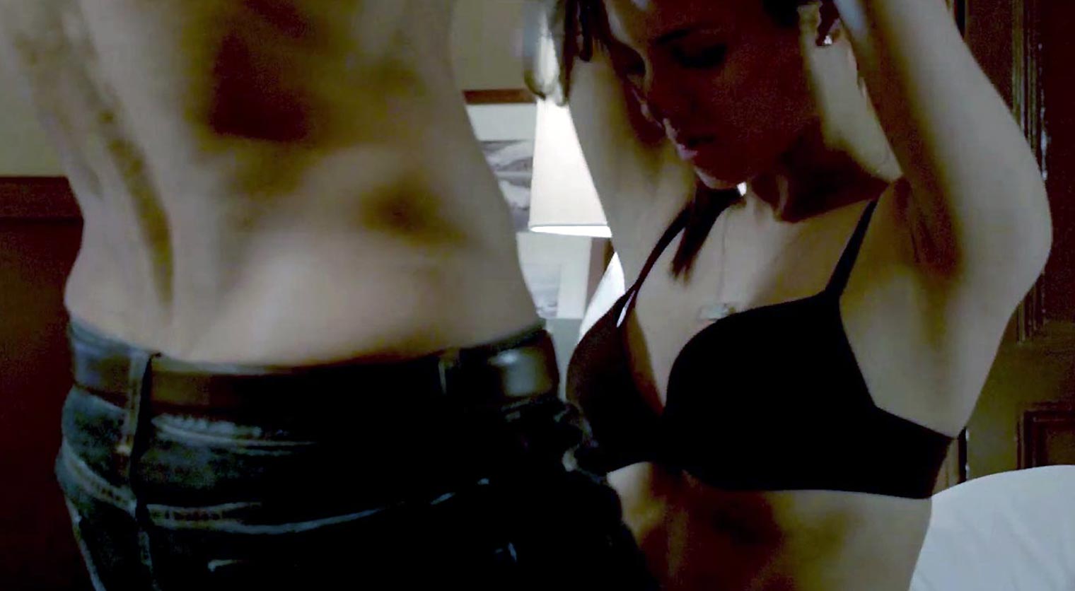 Slowly standing up in bed and making out with a friend, then getting even more into it as they roll over onto her stomach, then sitting up again to strip her shirt, revealing a black bra, and then lying back down with him on top kissing her, her neck, and her body.