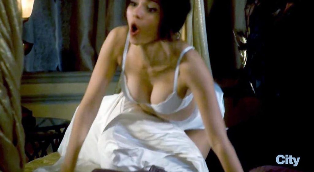 Victoria Justice flaunts her cleavage and body while rolling around on the bed with a guy and singing to him in just a white bra and slip. He lifts her into the air several times and reaches behind her to feel up her breasts.