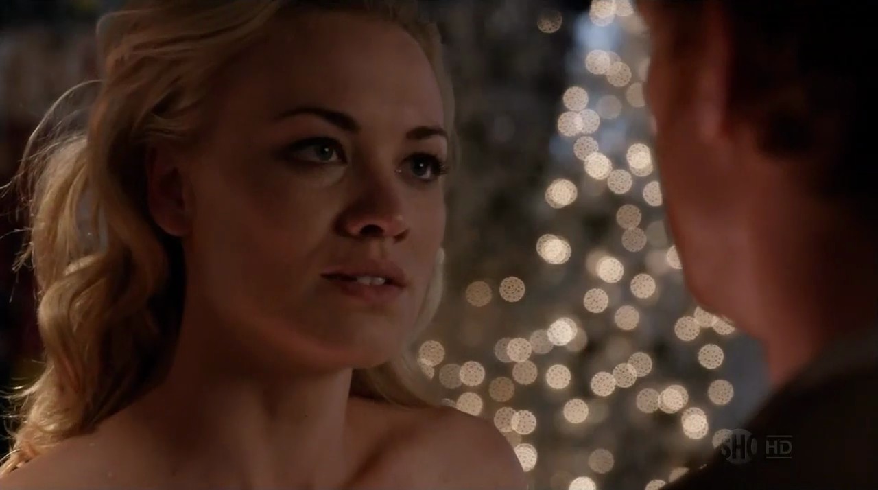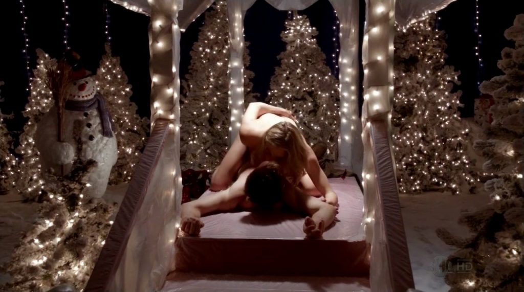 The next scene is from the same series. In this scene we see lying naked beside a guy, Yvonne Strahovski gets on top of him as she holds a knife to his throat, surrounded by holiday lights and winter decorations. She presses her breasts against his chest and almost shows her bare butt as the guy sits up in front of him and they have sex with Yvonne in his lap.