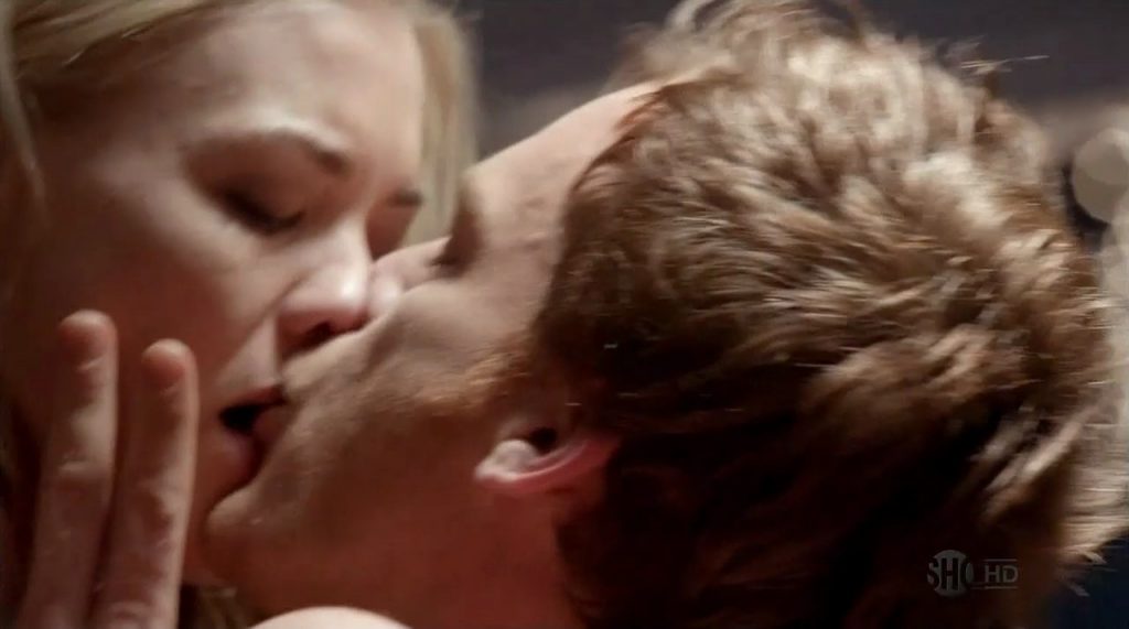 Here is the next and last scene from “Dexter”. Ian this scene we see Yvonne Strahovski kissing a guy as he undresses her, and then watching her flopping nude down on a bed with him, her nipples just out of reach or hidden by the guy as she and the guy have sex with Yvonne beneath him.