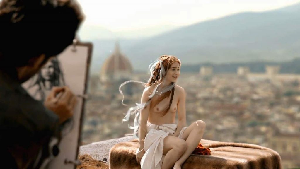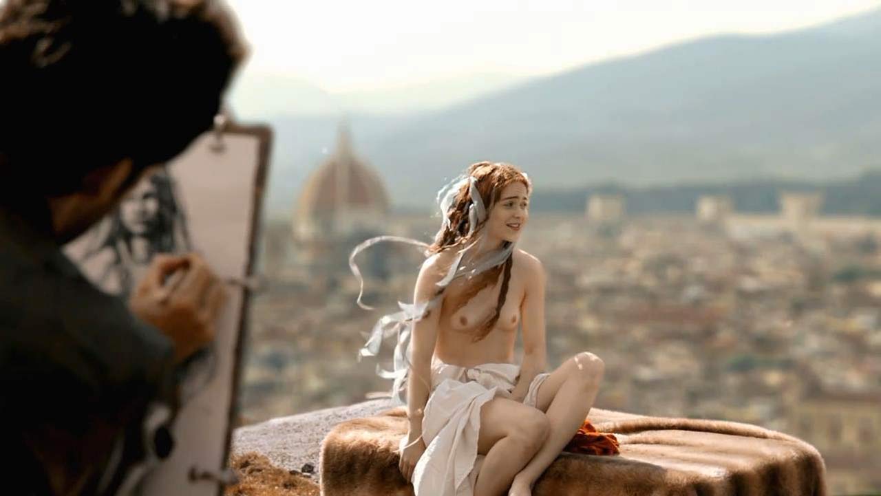 Oh boy, there is young tits scene in ‘Da Vincis Demons’, where you can see her small boobs while the man is photographing her!